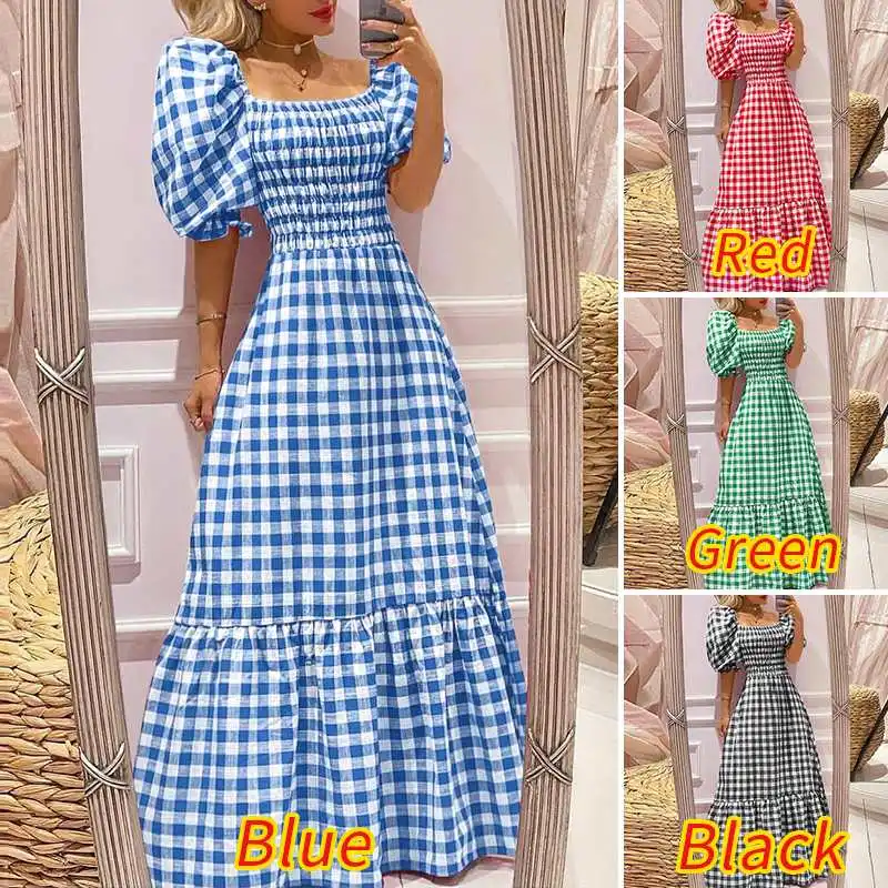 Платье-макси VONDA женское Плиссированное, повседневное винтажное клетчатое вечернее в богемном стиле, с коротким рукавом и квадратным вырезом