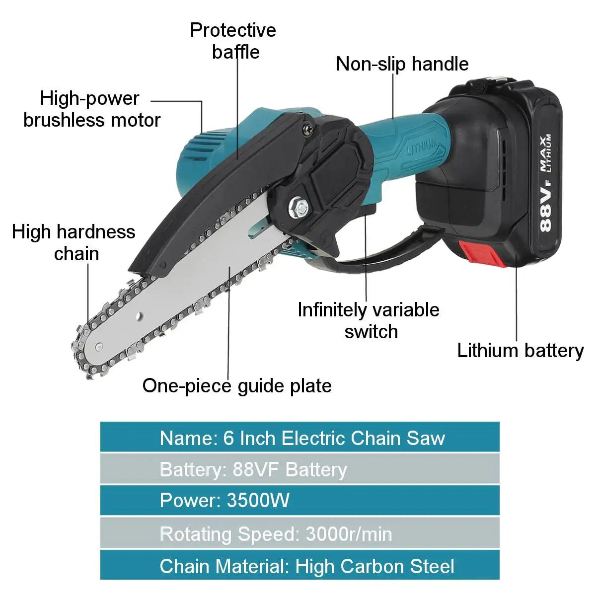 Новый 6 дюймов 3500W 88VF Мини Электрическая цепная пила с Батарея индикатор Перезаряжаемые деревообрабатывающий инструмент для 12 Батарея EUUSAU разъем для подключения