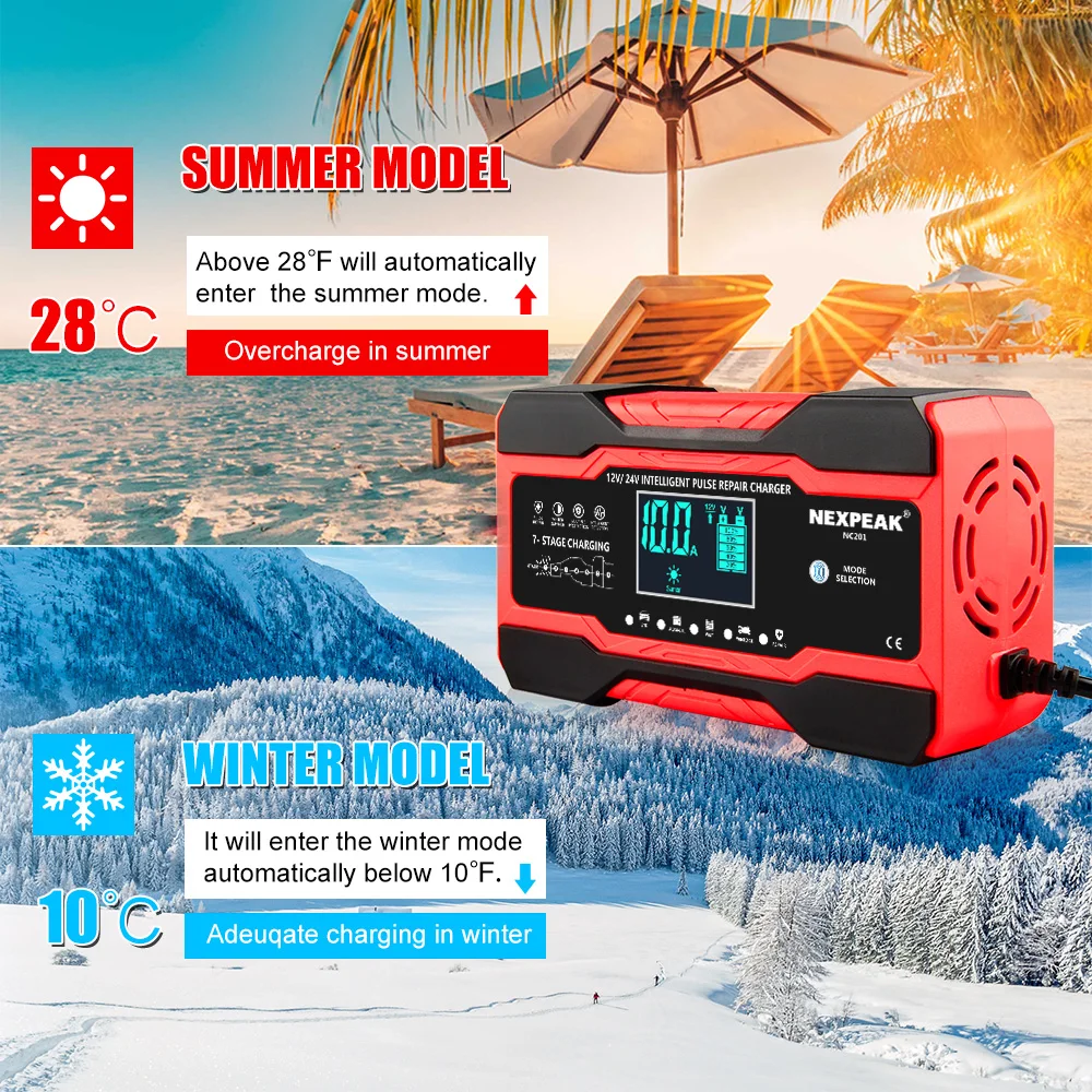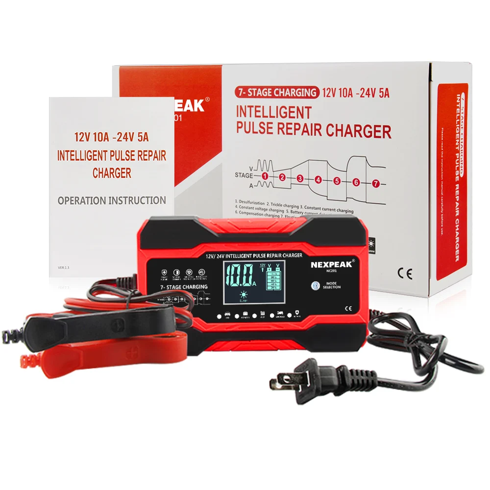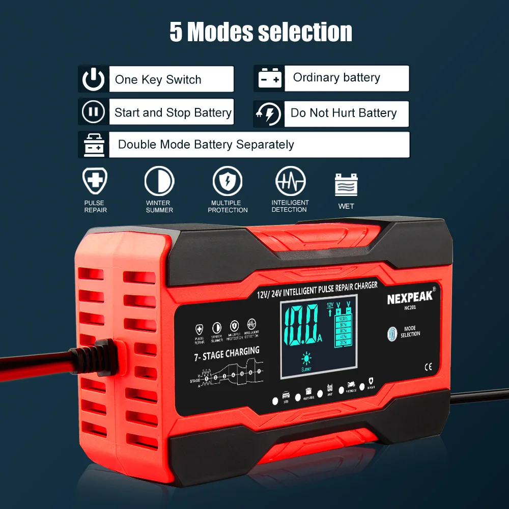 Автомобильное зарядное устройство для аккумуляторов 12 В 10 А-24 В 5 А, полностью автоматическое зарядное устройство для аккумуляторов с цифровым сенсорным ЖК-экраном и импульсным восстановлением, зарядное устройство s для влажного, сухого, свинцово-кислотного аккумулятора