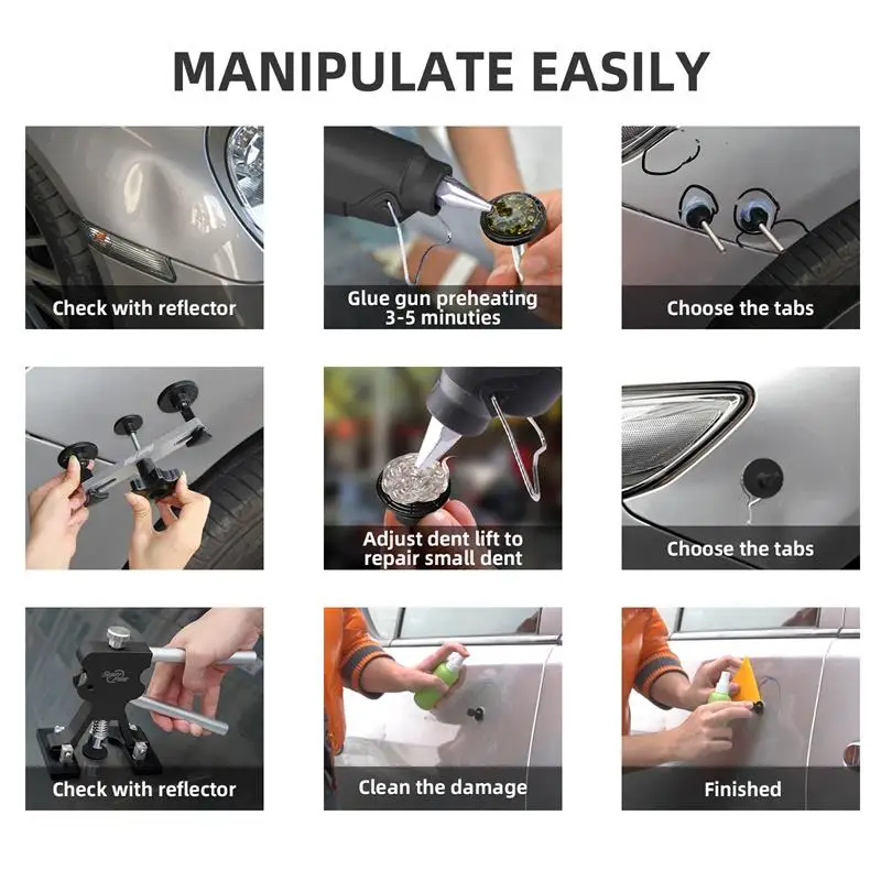 1 * подъемник для вмятин черного золота1 * Черный клеевой пистолет1 * Перемычка вмятин22 * черные клеевые вкладки1 * резиновый скребок5 * желтые клеевые палочки5 * черные клеевые палочки1 * серая ткань1 * Инструкция1 * пустая бутылка1 * резиновый молоток4 * черная ручка