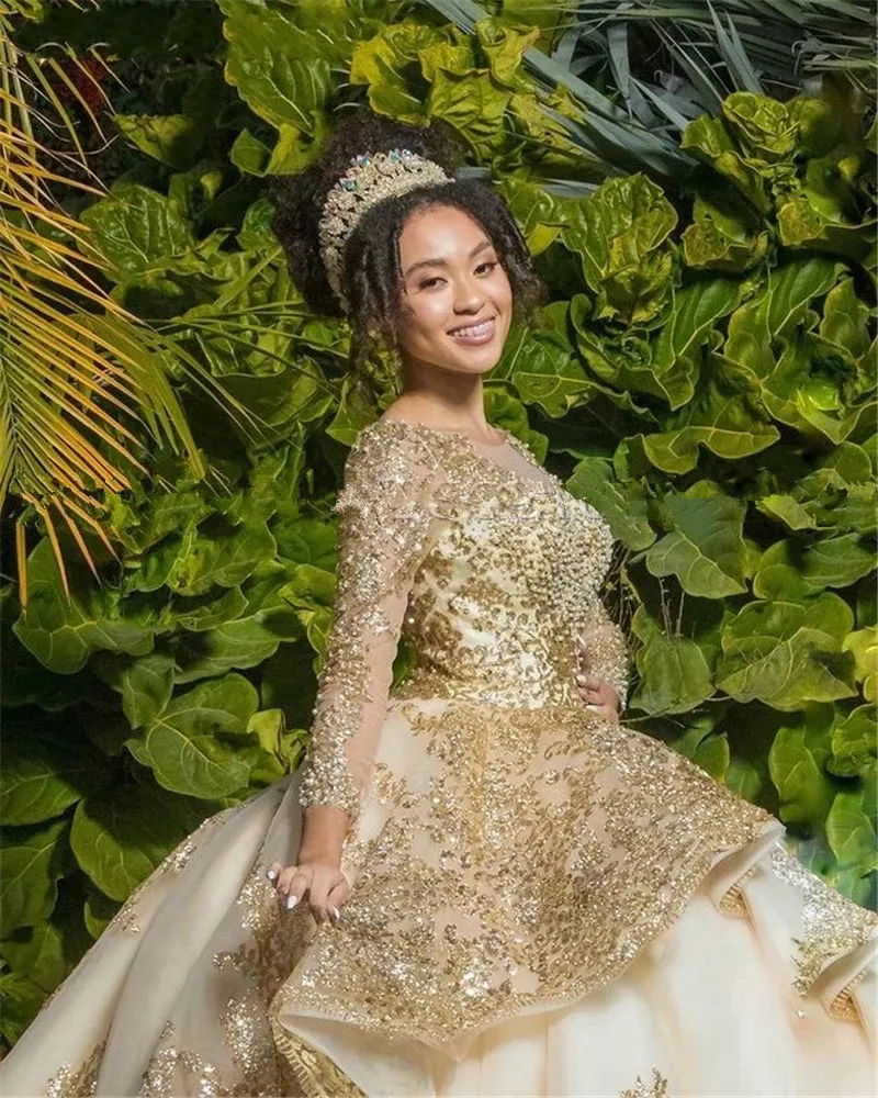 Платья Quinceanera цвета слоновой кости с длинным рукавом, 2021 кружева, Аппликация Прозрачный шеи, винтажное милое 16-дюймовое платье для девочек