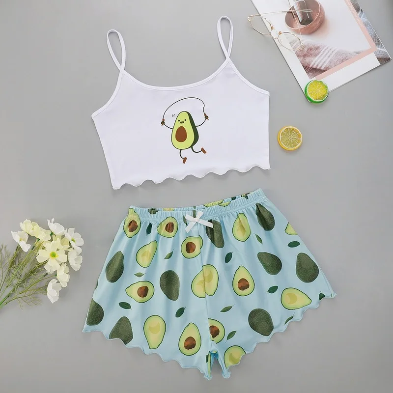Женский пижамный комплект Qweek, кофточка от пижамы и шорты с принтом авокадо, короткий жилет из хлопка, без рукавов, для весны и лета