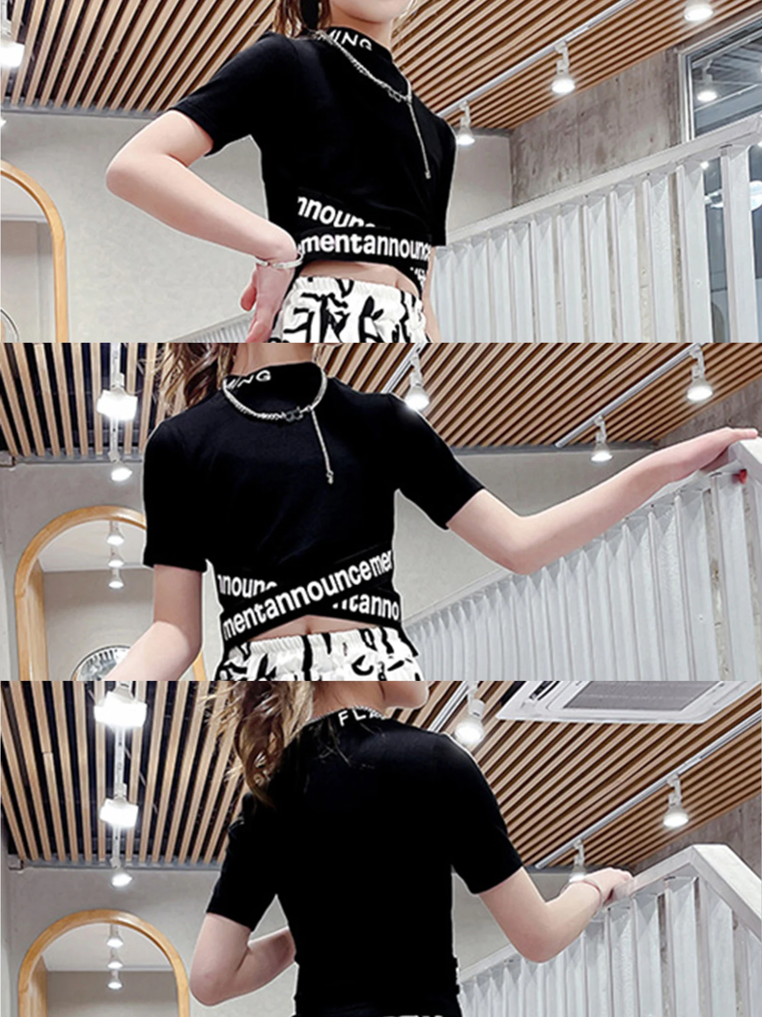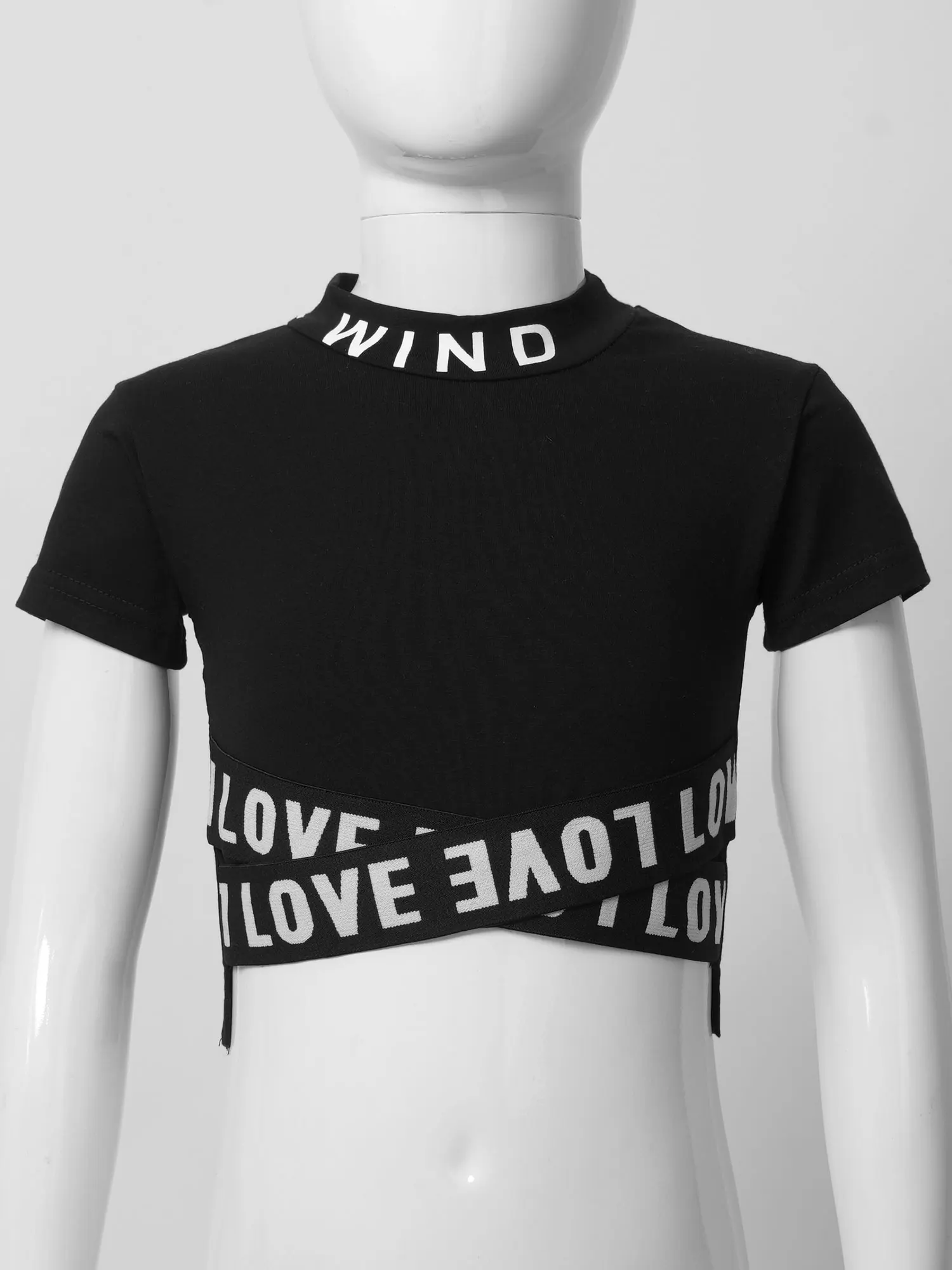 #120-160 Летние Стильные наряды для девочек с круглым вырезом, короткими рукавами, принтом букв, перекрестными лямками, укороченный топ с эластичным поясом, с граффити, буквами, повседневные комплекты