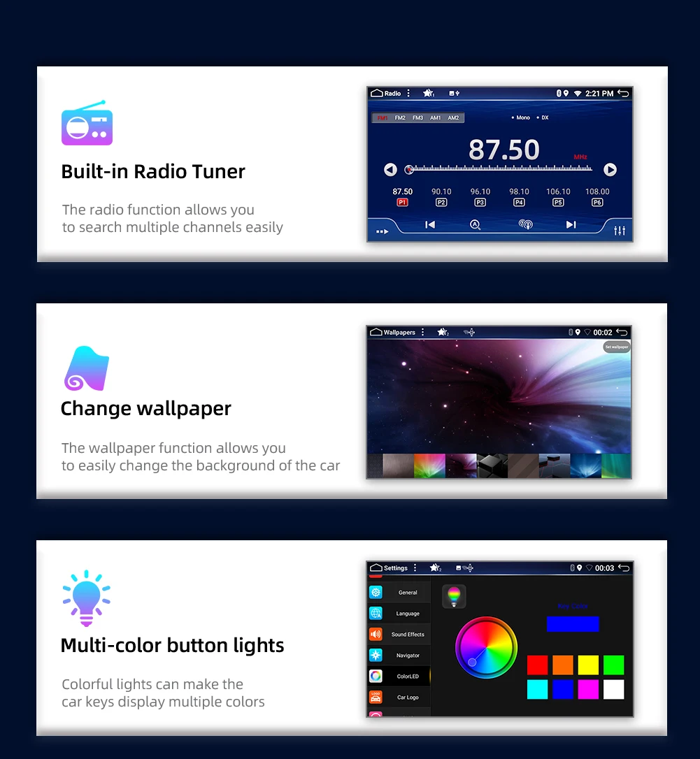 DSP + Carplay + сенсорный экран + радио + FM/AM + RDS + gps-навигация + карта + Wifi + Bluetooth + управление рулевым колесом + сплит-экран + USB + SD + AUX in/Out + зеркальная ссылка + камера заднего вида + сабвуфер + Play Sore + эквалайзер + набор обоев + логотип автомобиля + 3G/4G + TPMS + DAB + OBD 2 + DVR + TV