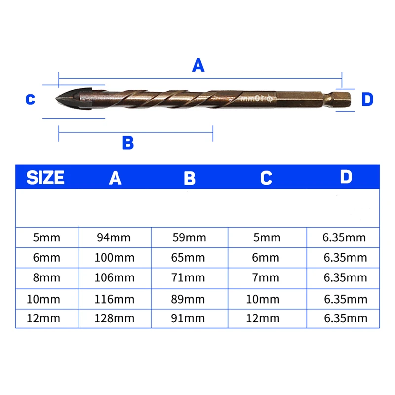 Особенности:Высокое качество: Изготовлен из твердого сплава, отличается прочностью и износостойкостью.Хорошая производительность: сопротивление разрезу невелико, увеличивает скорость открытия.Применение: легко устанавливается в ручную дрель, электрическая дрельИспользование: идеально подходит для керамики, плитки, камня, дерева, пластика, бетонной стены для сверления отверстий.Используйте детали, которые не будут игнорироваться:1. Следующие материалы могут быть непосредственно просверлены:Железо/медь/алюминиевый сплав/дерево/пластик/застекленный кирпич/античный кирпич/бетон/пузырьковый кирпич/красный кирпич и т. д.2. При непрерывном бурении добавьте воду, чтобы охладить ее, чтобы избежать сжигания кирпичей:Керамическая плитка/витрифицированный кирпич/стекло/мрамор и т. Д.Технические характеристикиДиаметр сверла: 5 мм/6 мм/8 мм/10 мм/12 ммМатериал: жесткий сплавЦвет: коричневый