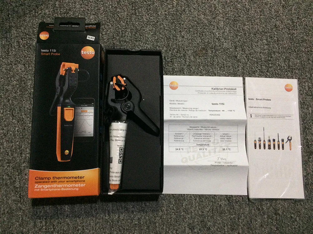 Объем поставки1 x термометр testo 115i с зажимом, работающий через смартфон, включая батареи и протокол калибровки.