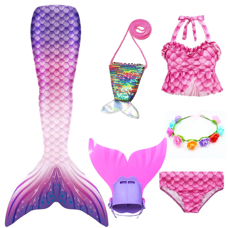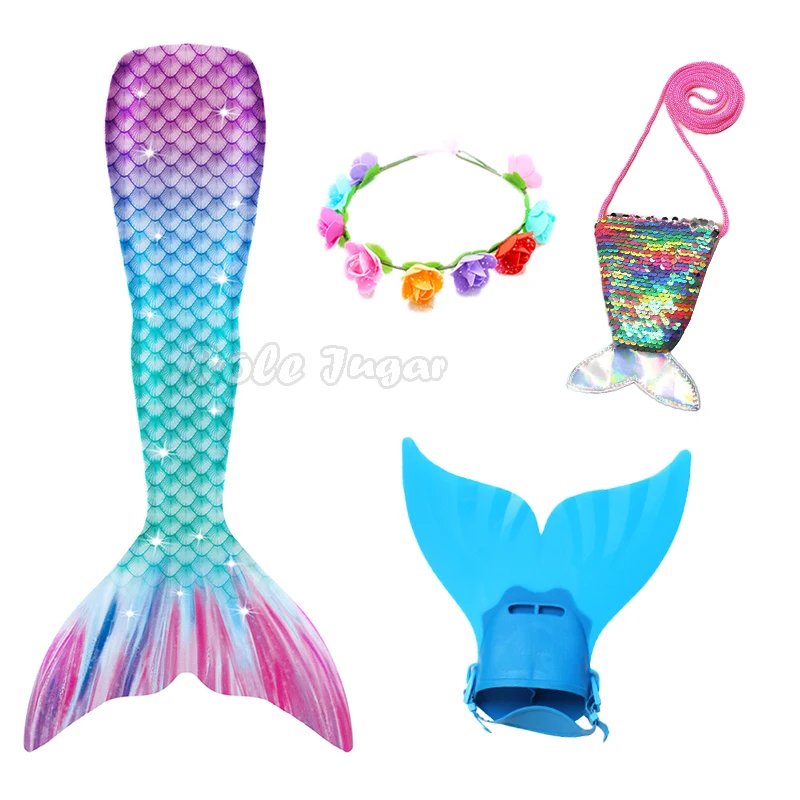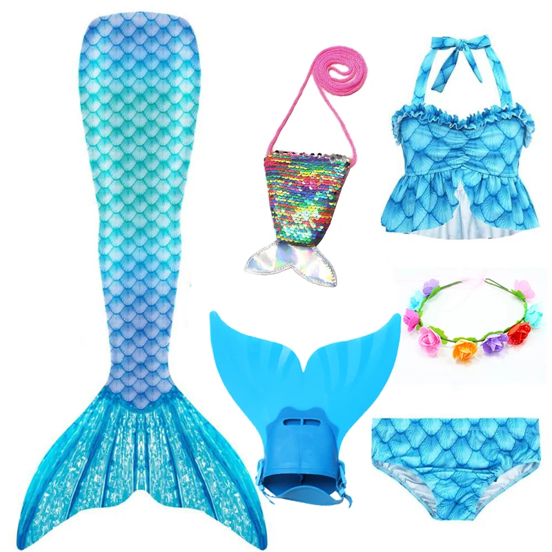 4 шт.: 1 * платье с хвостом русалки + 1 * монофин + 1 * венок + 1 * мешок русалки