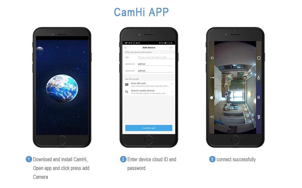 1. Загрузите и установите CamHi, откройте приложение и нажмите кнопку добавить камеру;2. Введите devuce cloud ID и passward;3. Подключение успешно.