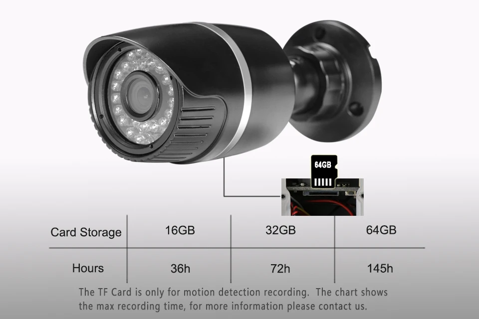 В камере есть слот для tf-карты (до 64 Гб опционально), и карта TF будет записывать, когда срабатывает Обнаружение движения.Внимание: tf-карта предназначена только для записи движения. Таблица показывает Максимальное время записи, для получения дополнительной информации, пожалуйста, свяжитесь с нами.
