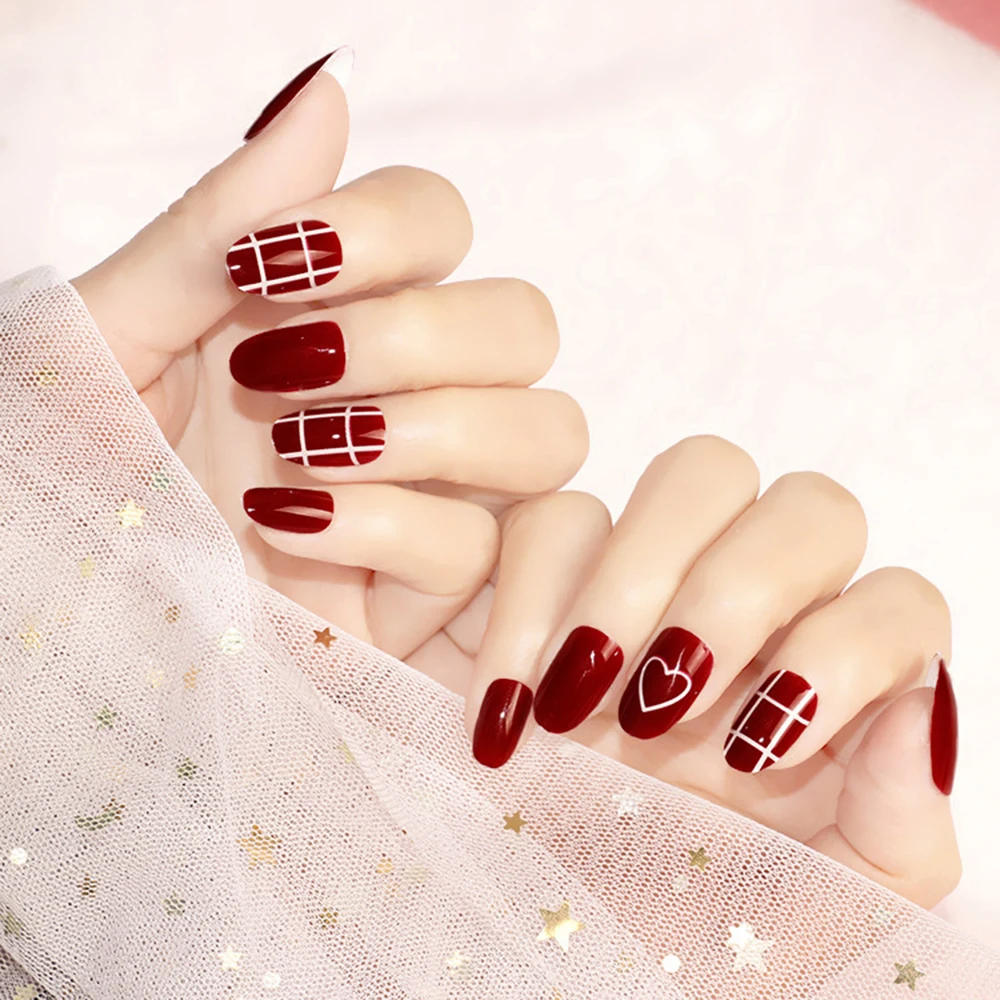 24 шт. французские короткие овальные накладные ногти милые девушки с красным сердцем смешанные решетчатые дизайнерские накладные ногти Съемные Декоративные накладные ногти
