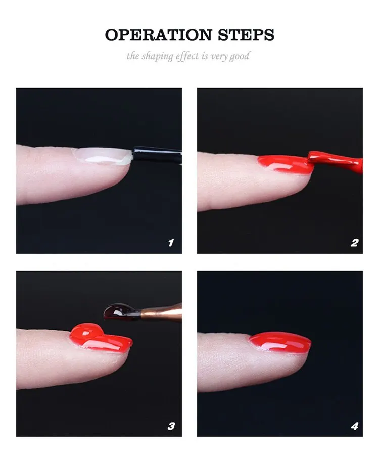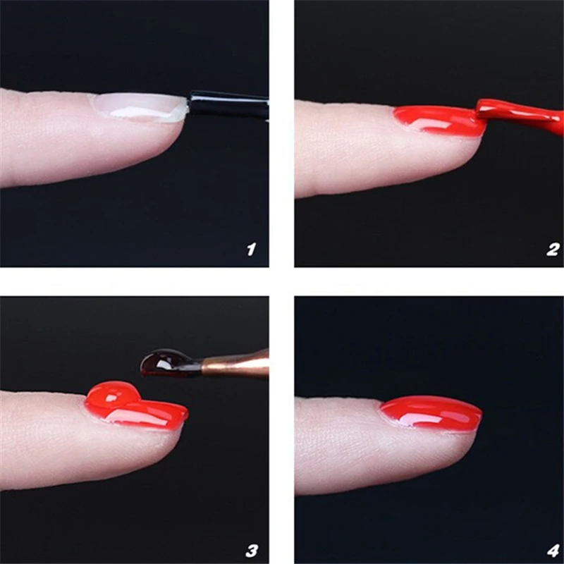 1. Нанесение базового покрытия, лечение с помощью сушилки для ногтей2. Нанесение армирующего геля, лечение с помощью сушилки для ногтей3. Нанесение цветного геля, лечение с помощью сушилки для ногтей4. Нанесение верхнего покрытия, лечение с помощью сушилки для ногтей5. ГотовоИспользование УФ-лампы 2 минуты или светодиодный светильник 30 секунд