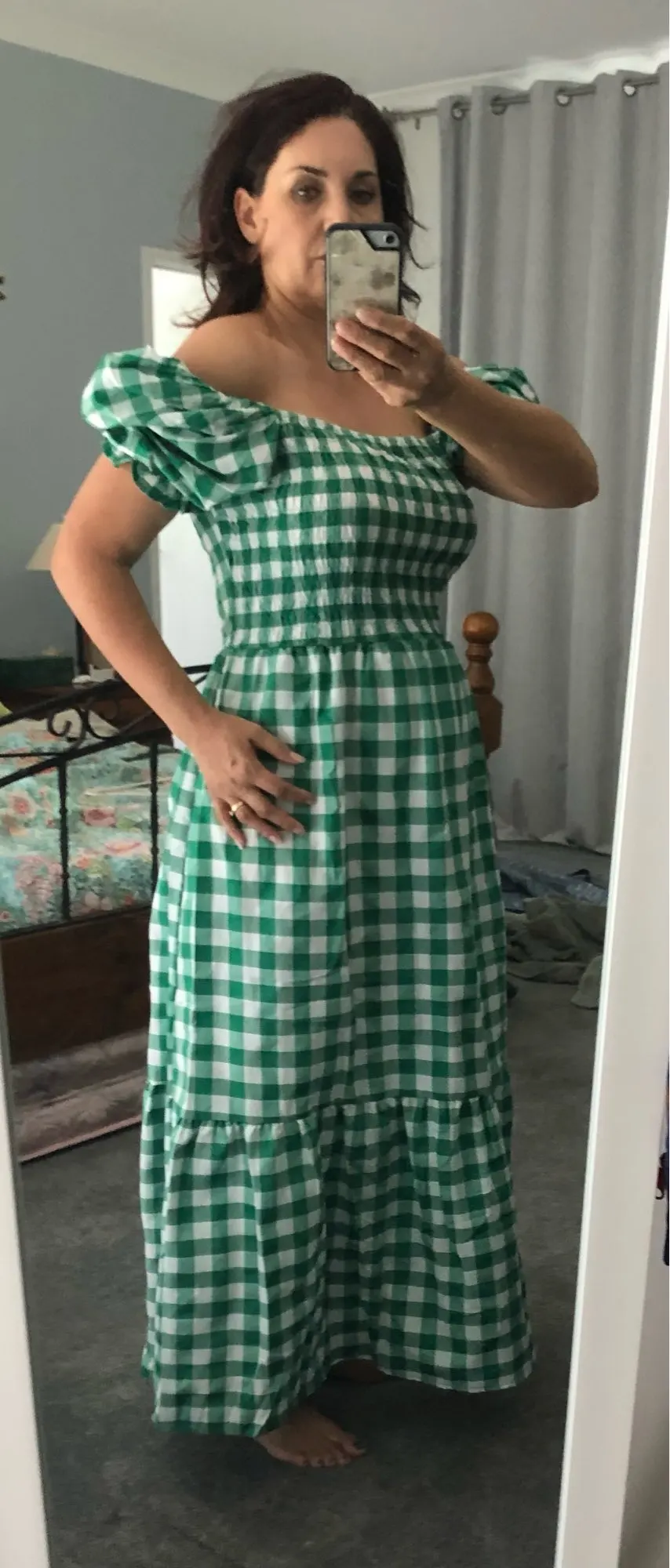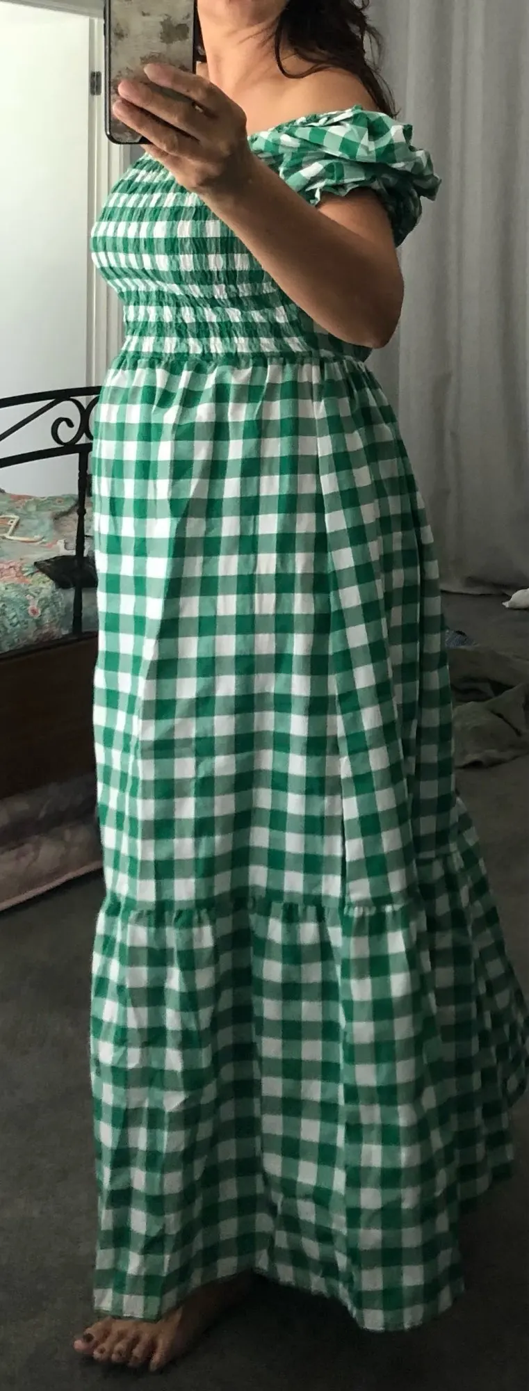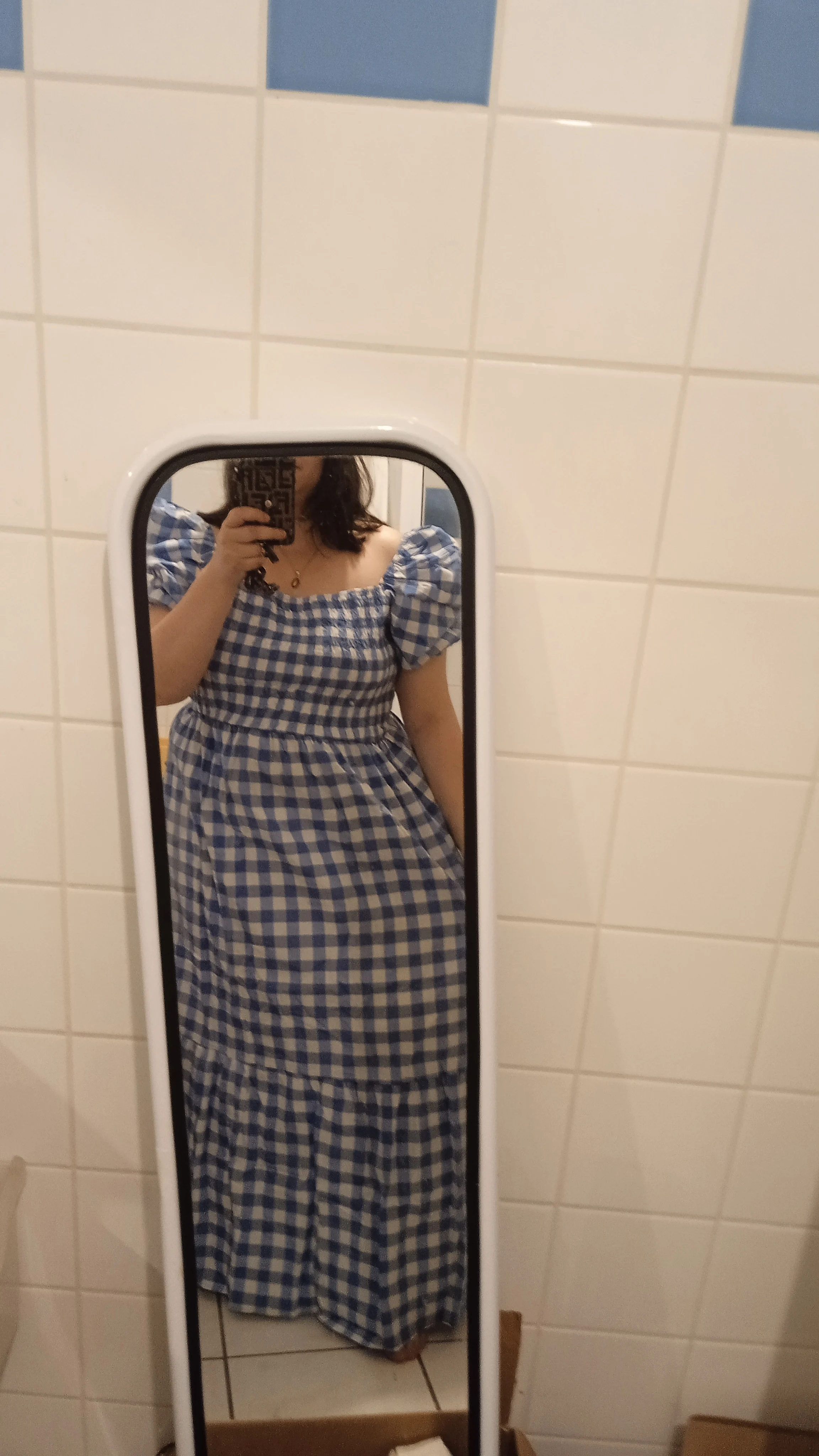 Я размер М, а размер супер правильный. Не маленький по размеру .... Так что не просите размер больше, чем вы, потому что тогда он будет слишком большим для вас ..... Длина идеальна, я короткая, и она совсем не тянет, я думаю, что с низкими сандалиями она идеальна... Ткань, это соотношение цены и качества ..... Ты не можешь просить больше. Модель прибита к изображению и форме рукавов, просто впечатляющая. Very fast shipping. Спасибо, продавец.❤️