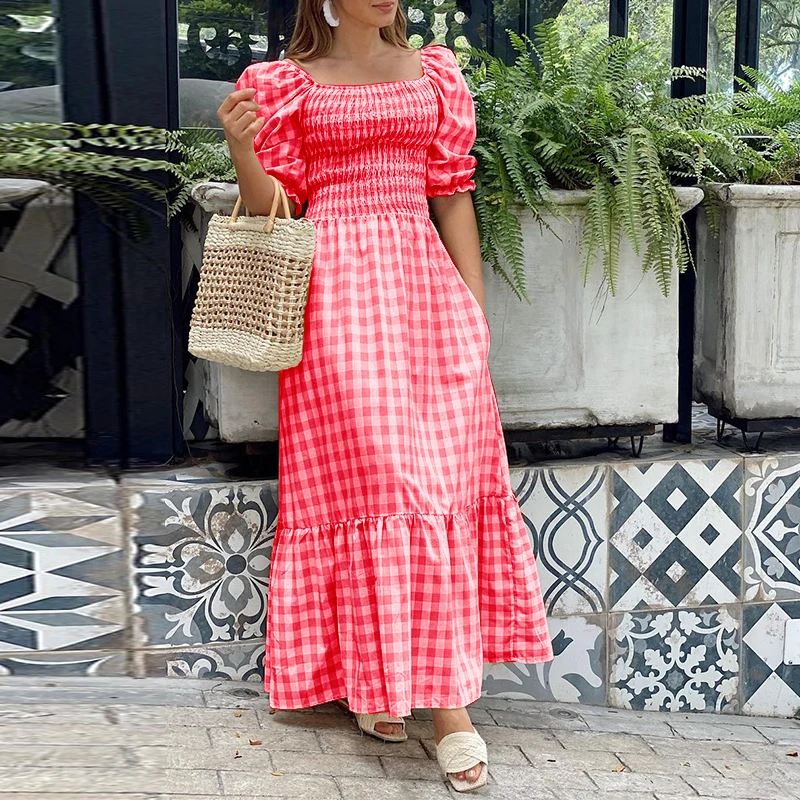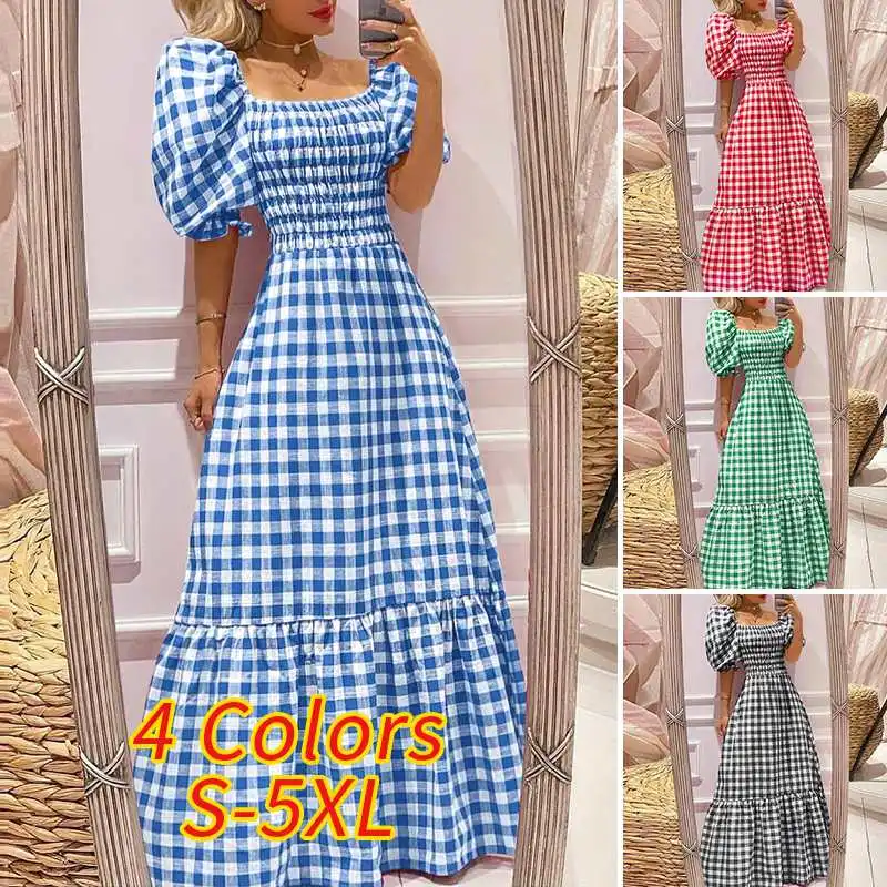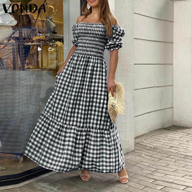 Летнее платье для вечеринок, женское зеленое платье 2022 VONDA, винтажные платья макси с коротким рукавом и квадратным вырезом в клетку, праздничные платья