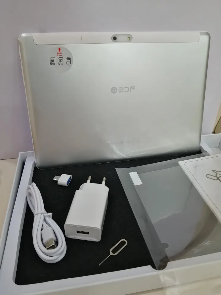 Заказ пришёл быстро. Комплектация как в описании - полностью соответствует. Планшет заряжен, есть два слота для sim карт и один слот для SD card. На скорость и производительность не тестировал, но как устройство для связи по вотсапп и просмотр картинок и фильмов полностью соответствует.