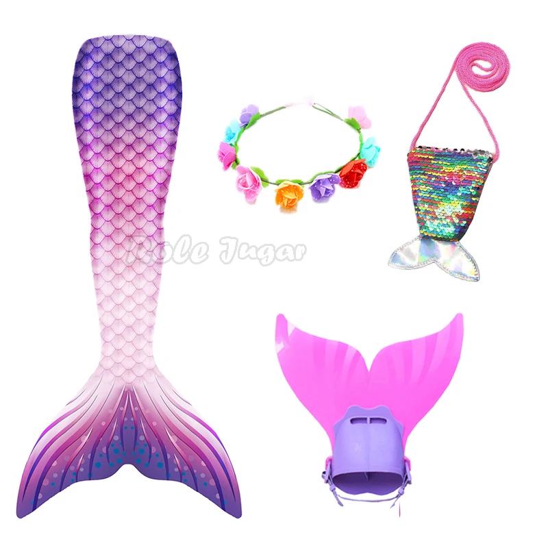 4 шт.: 1 * платье с хвостом русалки + 1 * монофин + 1 * венок + 1 * мешок русалки