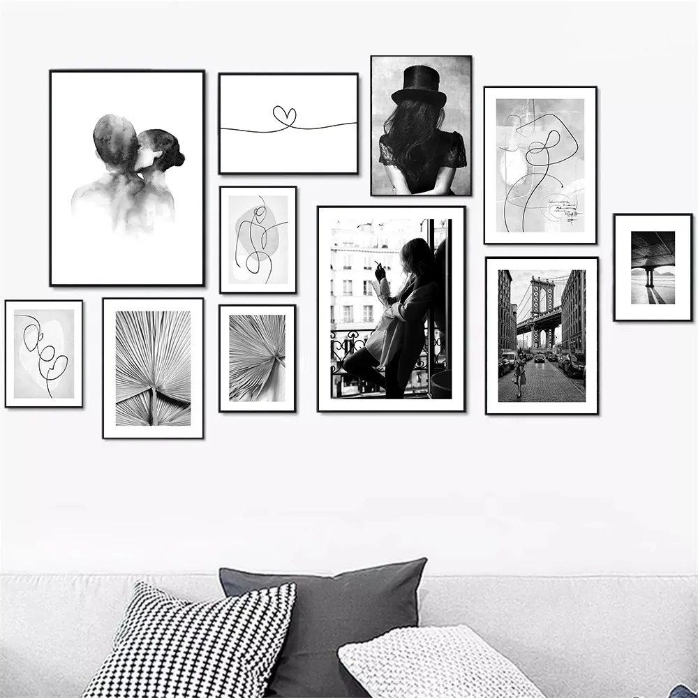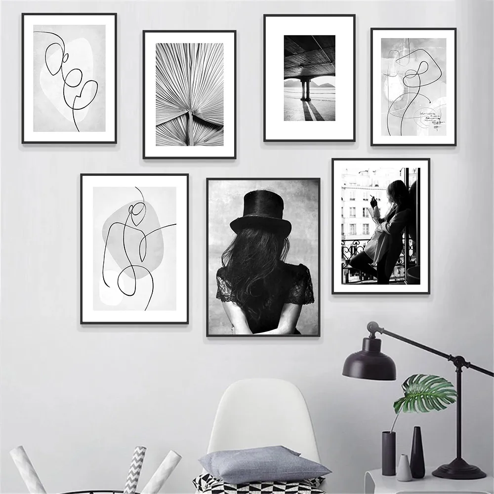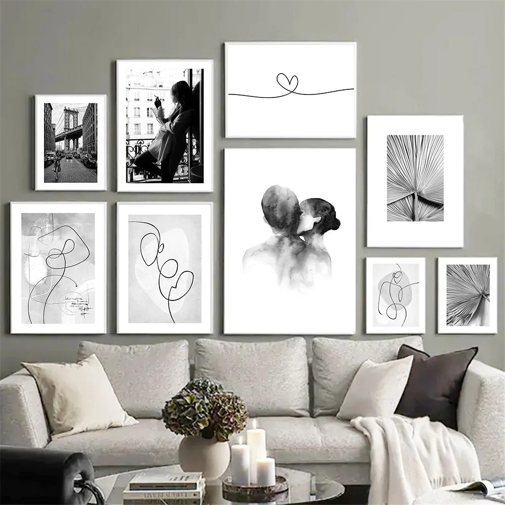 Абстрактная фигурка, линейная живопись, пальмовый лист, ВИНТАЖНЫЙ ПЛАКАТ, черно-белый поцелуй, настенное искусство, печатная картина, декор для гостиной