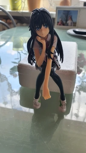 Центр тяжести смещен вперед, посадить фигурку на ровную поверхность как на фото (например, на полку) или даже на ровный угол с вертикальной поверхностью (например, на колонки) - нельзя.