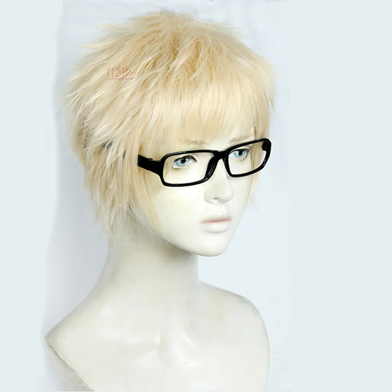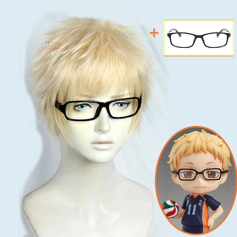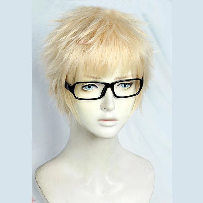 Аниме Haikyuu! Kei Tsukishima Косплей короткий светильник, золотой парик, очки, жаростойкие волоконные волосы + шапочка для парика, вечерние, ролевые игры для взрослых