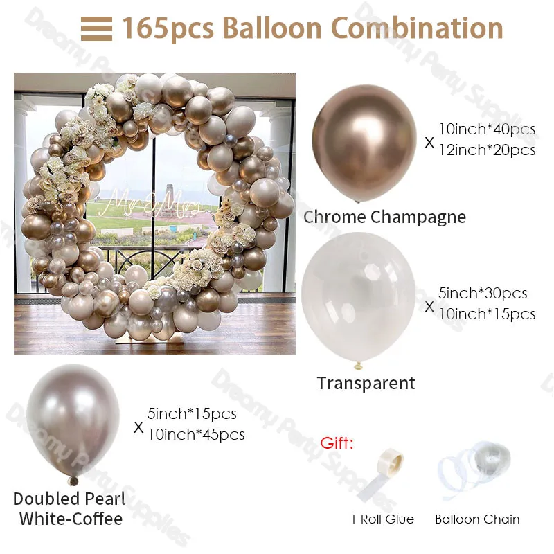 Хромовое шампанское (10 дюймов * 40 шт., 12 дюймов * 20 шт.) Прозрачный (5 дюймов * 30 шт., 10 дюймов * 15 шт.) Двойной жемчужный белый-кофейный (5 дюймов * 15 шт., 10 дюймов * 45 шт.) Бесплатная доставка: 5 м цепочка на воздушный шар * 1 Воздушный шар Клей * 100