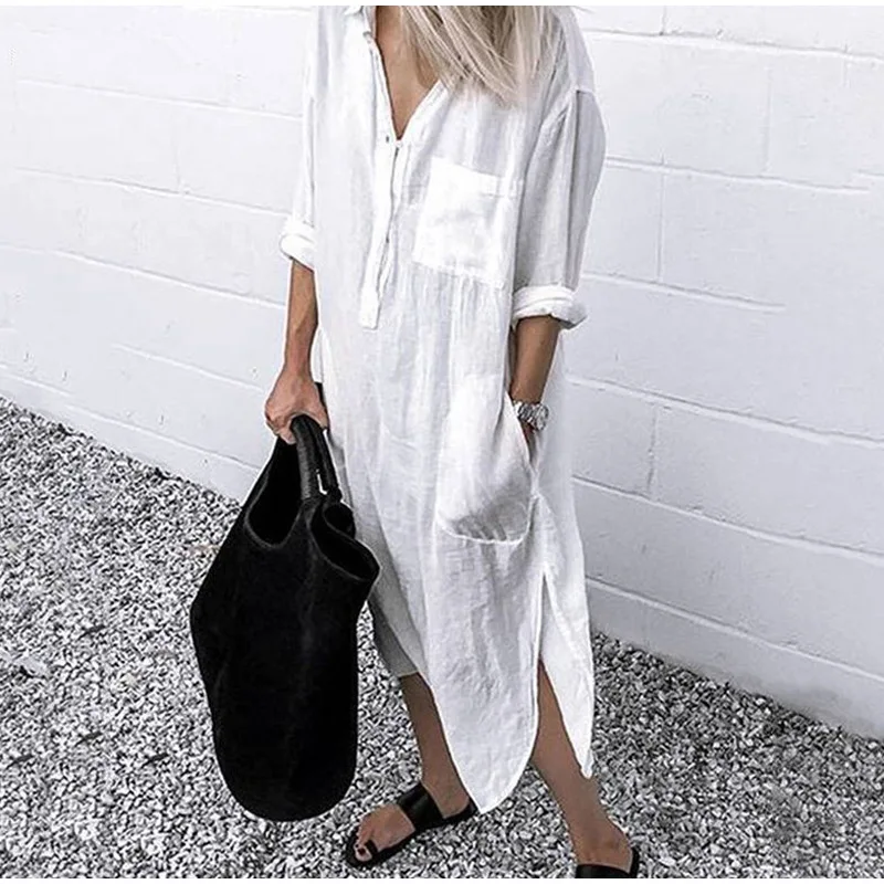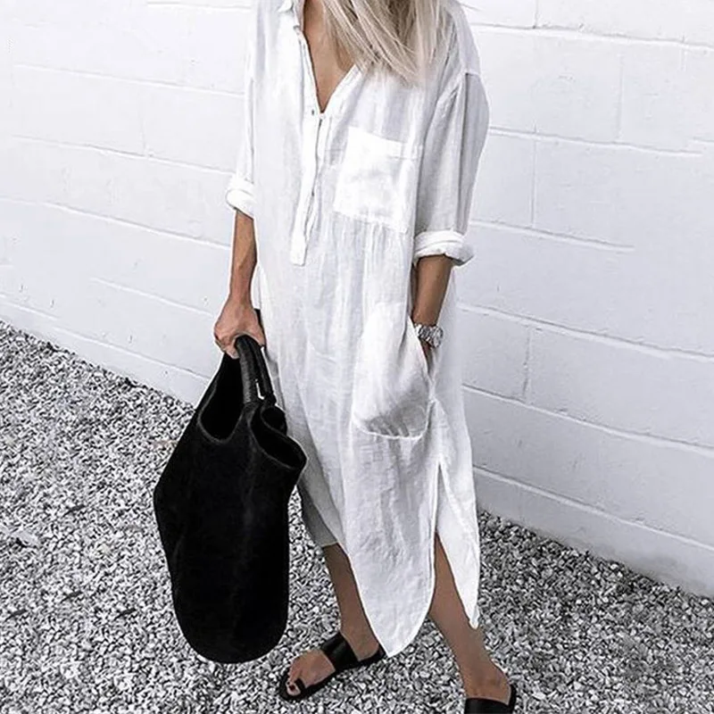 Женское однотонное Повседневное платье миди с длинным рукавом и отложным воротником, асимметричное платье с разрезом по бокам, женское летнее платье простого стиля размера плюс 5xl