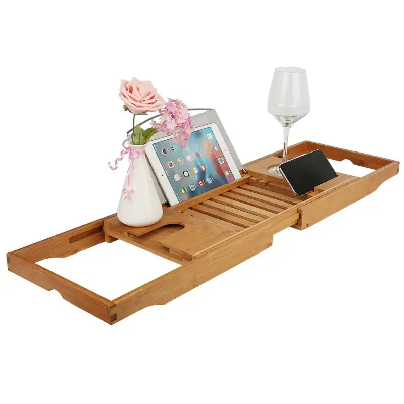 Сидение в ванне всегда приятное и расслабляющее впечатление, но через несколько минут все туалетные принадлежности должны быть возвращены, чтобы испортить вашу релаксацию; Благодаря функции и расширяемому дизайну, можно широко использовать в большинстве ванн по форме и размеру. Превратите вашу ванну в расслабляющий семейный спа, который удовлетворит ваши потребности. Наша стойка для ванны включает в себя держатель для стекла, место для хранения смартфонов и регулируемый держатель для планшета/книги. Этот продукт изготовлен из натурального прочного и водонепроницаемого бамбука, который со временем не меняет цвет и не ржавеет, как металлическая корзина.