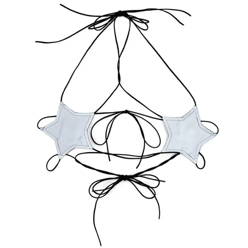 С завязками на шее, с бретельками на шее, на шнуровке, с перекрещивающимися ремешками, из искусственной кожи, с пятиконечным бюстгальтером в форме звезды.