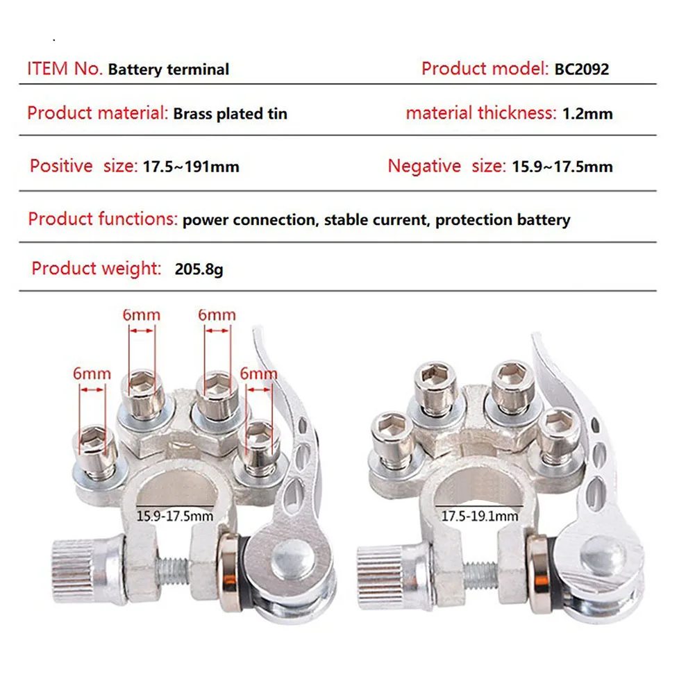 Подходит для разъема клемм аккумулятора типа SAE / JIS A с положительным полюсом (17,5-19,1 мм) и отрицательным полюсом (15,9-17,5 мм) автомобильных аккумуляторов круглого типа. Положительный и отрицательный зажим клеммы аккумулятора Подходит для большинства моделей аккумуляторов. Идеально подходит для замены изношенных и коррозионных клемм.