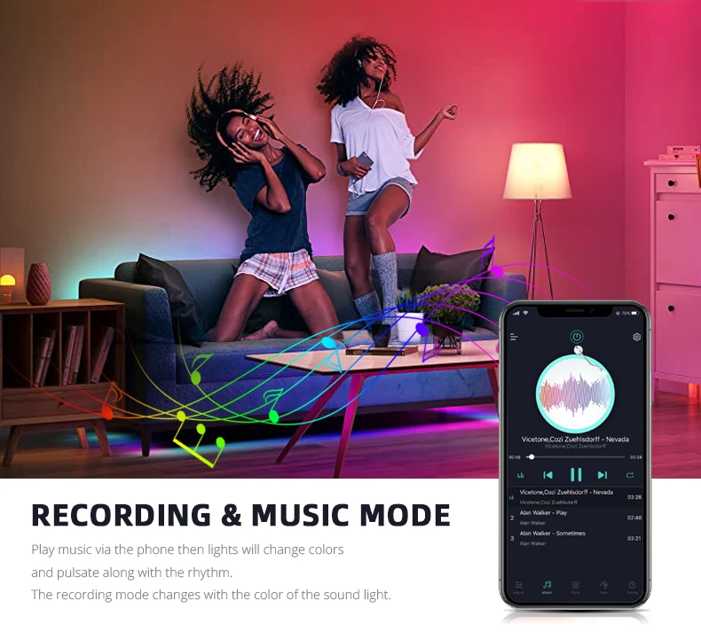 Требуется совместимое устройство Bluetooth 4,0.Встроенная функция хранения сохраняет окончательный цвет или режим программы.Работает с iOS 8,0 или выше и Android 4,3 или выше.16 миллионов настроек цвета, 20 встроенных динамических режимовВыбор цвета DIY, Функция синхронизации, Функция микрофона, функция музыкального режимаФункция выбора цвета сцены, функция регулировки скорости и яркости360 градусов, не нужно смотреть на светильник, когда пульт дистанционного управления.Групповое управление.Вы можете отсканировать qr-код на посылка для загрузки.Поддержка голоса: русский, немецкий, итальянский, французский, английский, испанский, упрощенный китайский.