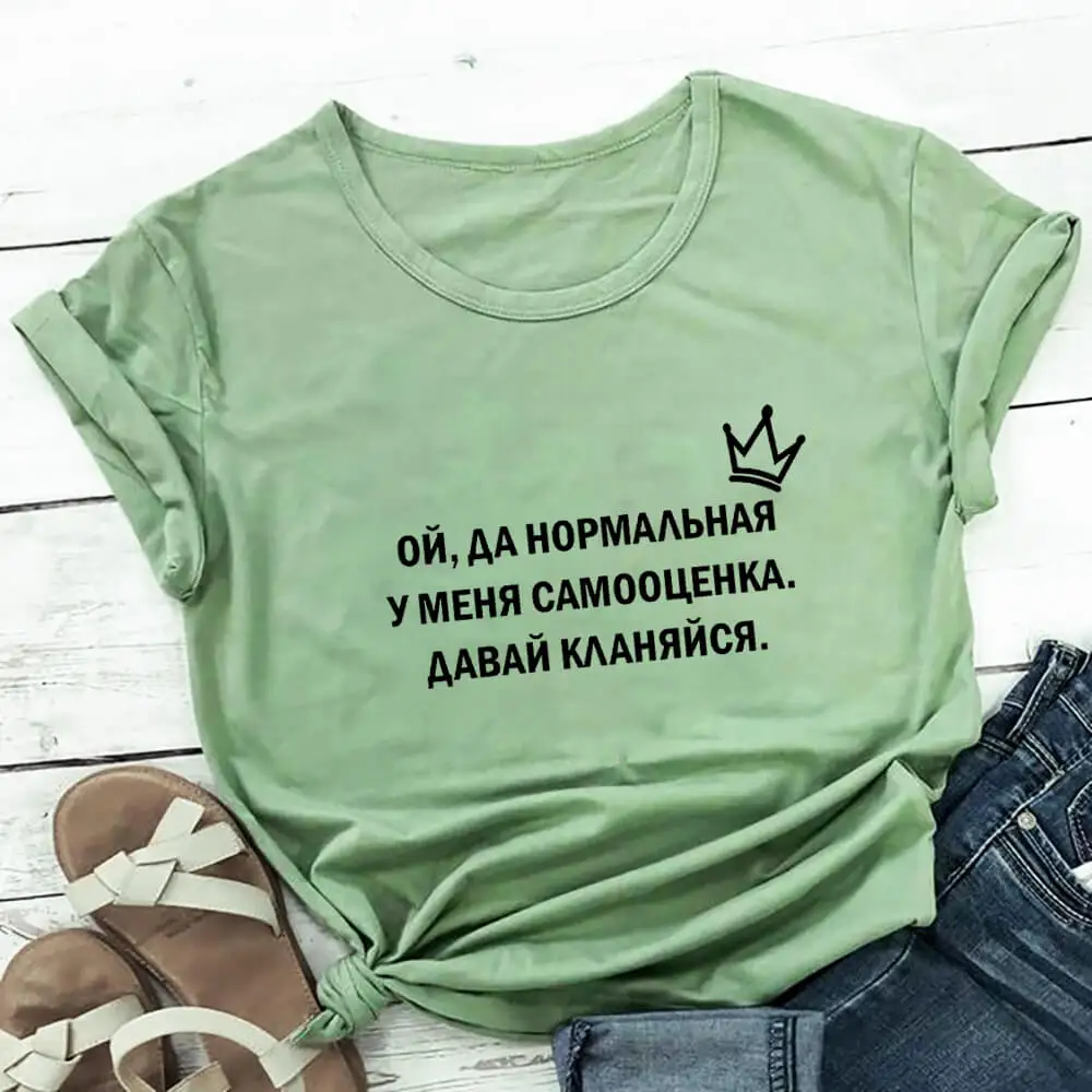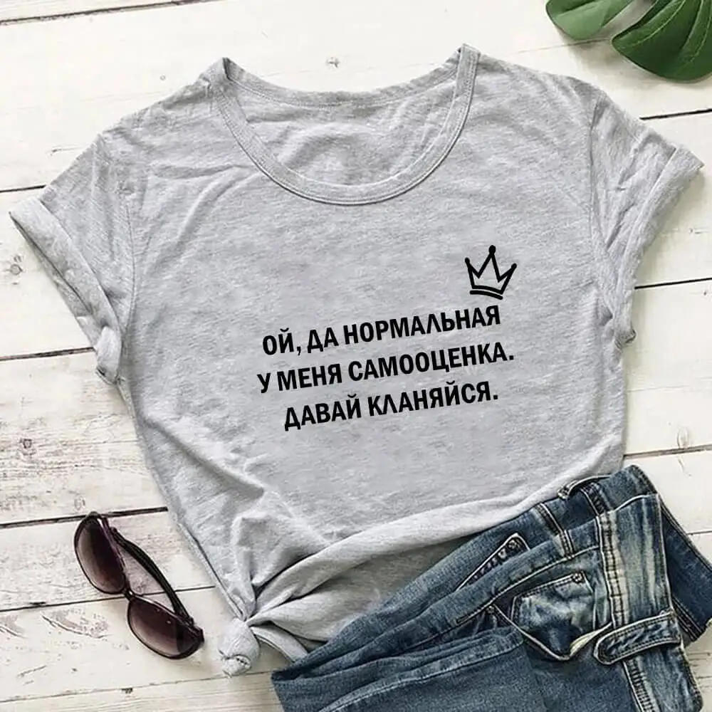 Нормальная у меня самооценка Женская футболка из 100% хлопка с русской кириллицей забавная летняя повседневная футболка унисекс с круглым вырезом футболка с короткими рукавами и надписью