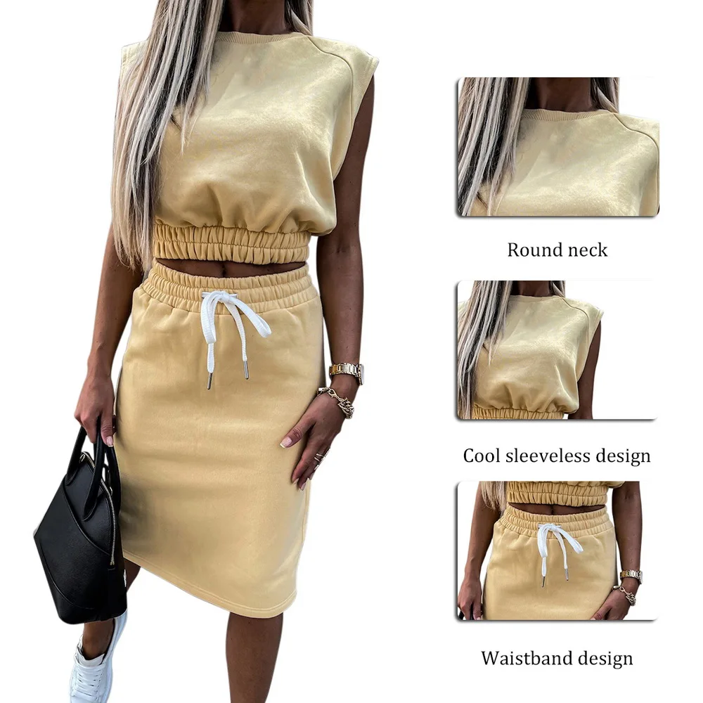 Женский тонкий комплект с юбкой, однотонный облегающий дамский костюм с юбкой, Свитшот без рукавов, укороченные топы с разрезом и шнуровкой на лето 2021