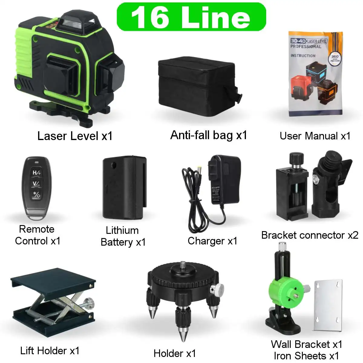 16 линий 360 горизонтальный вертикальный крест 4D зеленый светильник лазерный уровень самонивелирующийся супер мощный лазерный луч