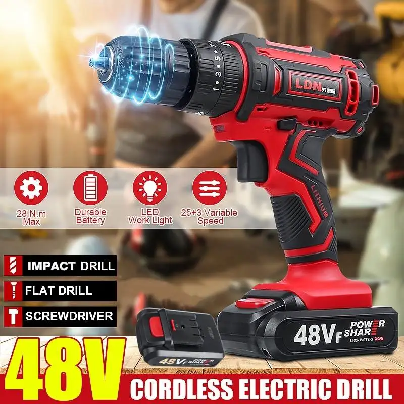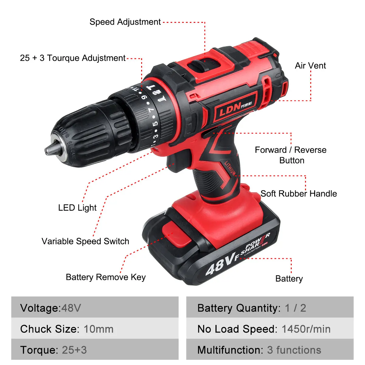 Посылка включает:1 электрическая дрель1 х адаптер питания1 или 2 батареи (опционально)Технические характеристикиНаименование: электрическая дрельНапряжение батареи: 48 В (штепсельная вилка США)Максимальный крутящий момент: 25-28 нмБез скорости нагрузки: 0-450р/мин, 0-1450р/минОсобенности-Питание от литий-ионной аккумуляторной батареи, обеспечивает более длительное время работы и большую мощность-Высокая эффективность двигателя, обеспечивает до 28N. М крутящего момента и 0-1450r/мин скорости-Сверлильный патрон для быстрой и простой замены бит-Использование вперед/обратный переключатель, 25-скорости крутящего момента-Переключатель вперед/назад может быть установлен в трех положениях:Вперед, назад и замок. Из-за блокировочного механизма, передний/обратный переключатель может быть отрегулирован только при отсутствии нажатия на триггер. Перед использованием переключателя вперед/назад двигатель всегда должен полностью останавливаться.-Светодиодный Светильник обеспечивает освещение в темных пространствах при работе-Эргономичная ручка com fort gr ips обеспечивает идеальный баланс и управление инструментами-3 этапа настройки: ударное сверление, плоское сверление и поворотные винтыПредупреждениеЧтобы уменьшить риск травм, надевайте защитные очки или очки с боковыми щитами.