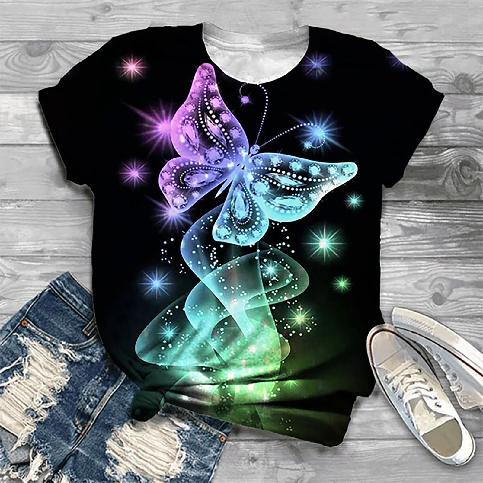 Футболка женская с флуоресцентным 3D-принтом бабочки, Повседневная футболка с круглым вырезом и графическим принтом, лето 2021