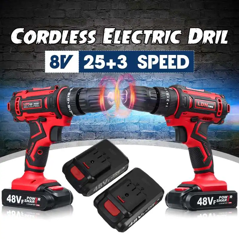 48V 25 + 3 знака после крутящий момент аккумуляторная ударная дрель электрическая отвертка дрель мини Беспроводной Мощность драйвер с 2 шт. литий-ионный Батарея 2-Скорость