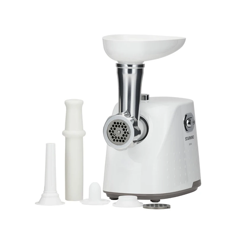 С этим универсальным прибором можно готовить не только мясо или овощи, но и сразу же приготовить кебб и домашнюю колбасу. Для этого в комплект поставки входят дополнительные насадки. Устройство мощностью 1800 Вт позволит скручивать около двух килограммов мяса в минуту. Двигатель мясорубки оснащен возможностью реверса, что может быть полезно, если кусок мяса застревает внутри.
