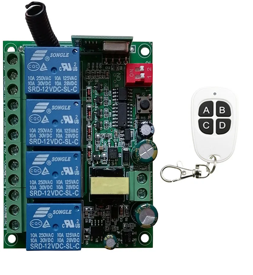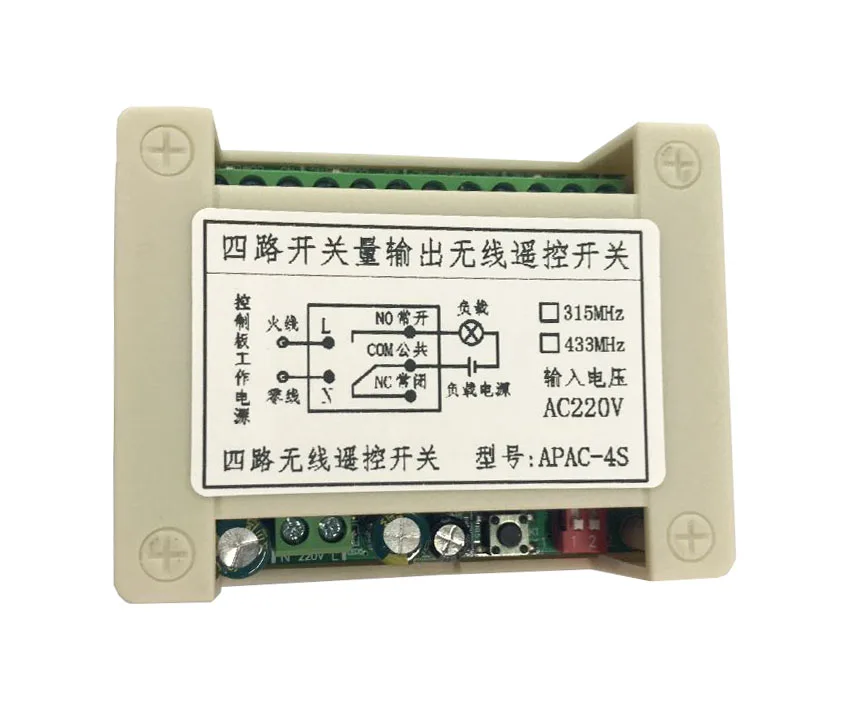 Компания проектирует и производит дорожный многофункциональный переключатель управления беспроводной связью для четырех релейных выходных сигналов, может сделать для управления оборудованием или электрическим переключателем или пройти, преобразования и различных специальных требований программы управления. Он в основном используется в электрических дверях, окнах, подъемном оборудовании, воротах, подъеме, промышленном контроле, освещении и электрическом управлении.