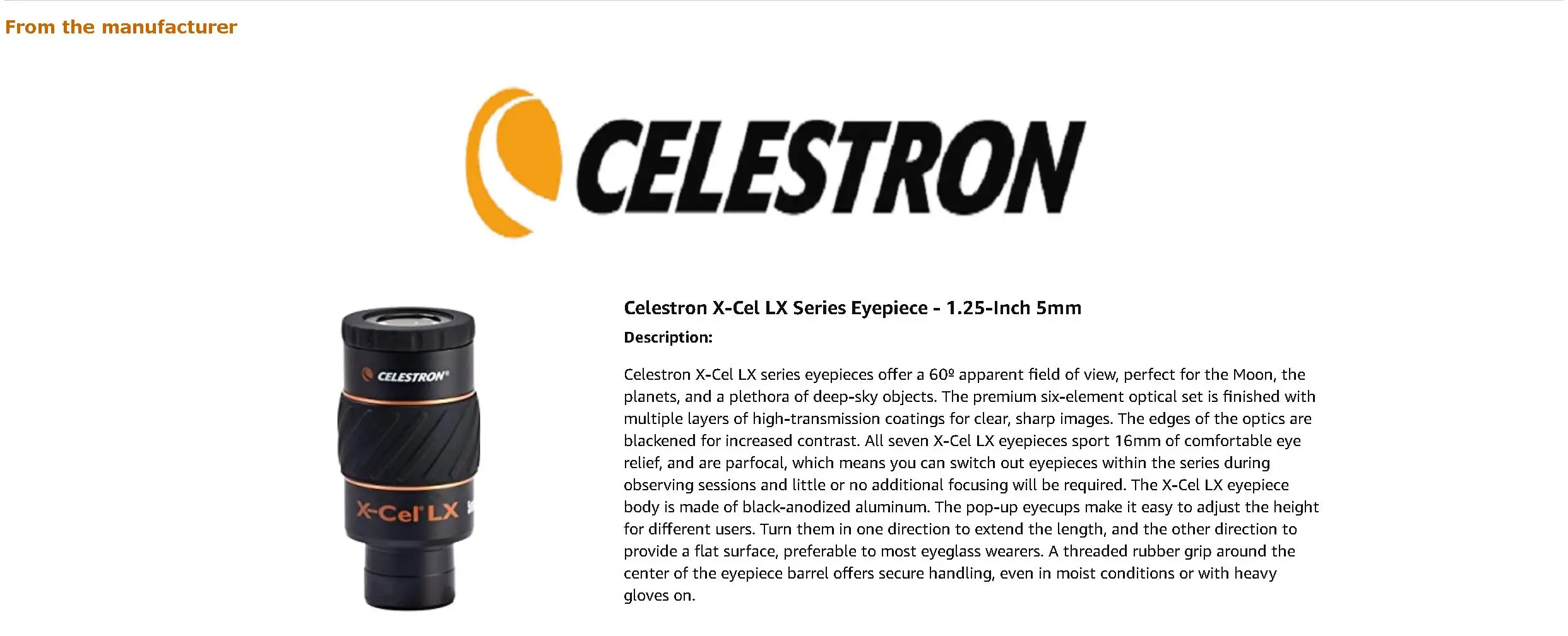Окуляры X-Cel LX, оптимизированные для планетарного просмотра, обеспечивают поле зрения 60 ° С помощью шестиэлементной полностью многослойной системы линз