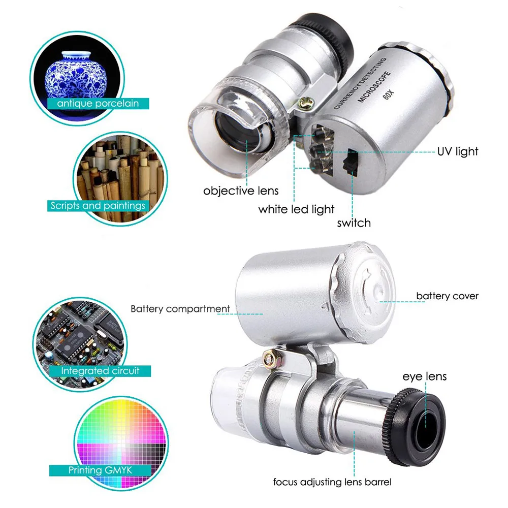Светодиодный микроскоп для ювелирных изделий, Карманная Лупа с 60-кратным увеличением, миниатюрное УФ-освещение для осмотра, алмазных штампов и т. д.