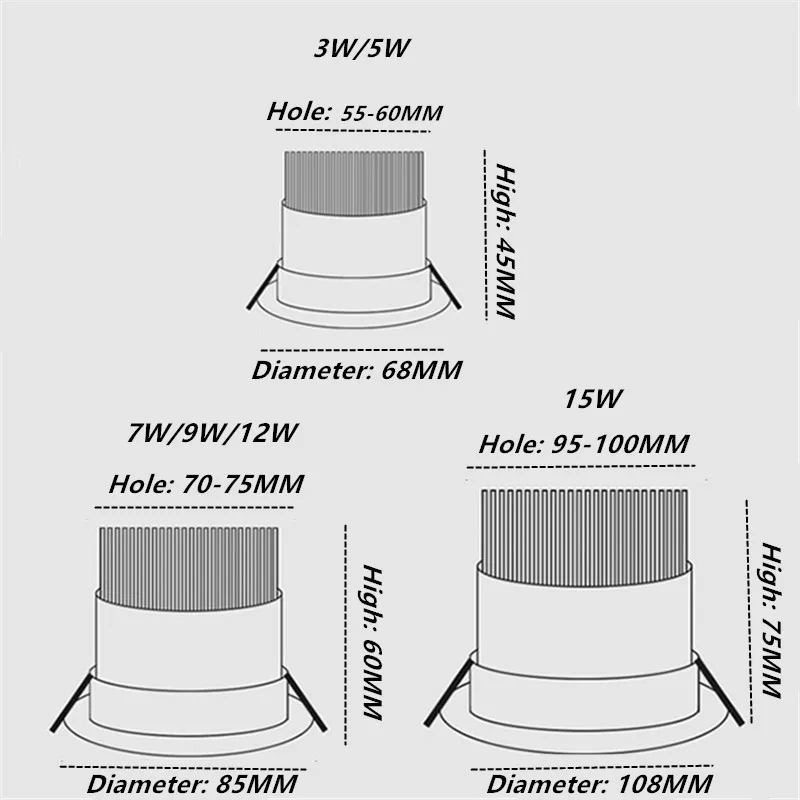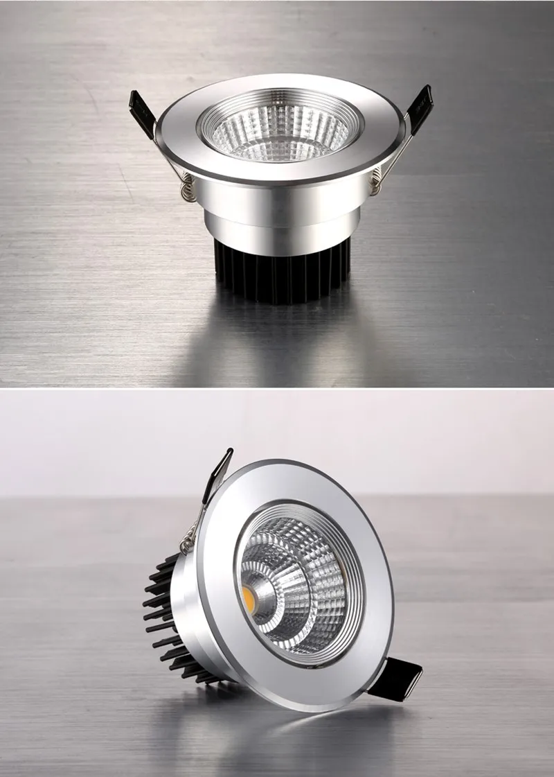 Встраиваемый алюминиевый Светодиодный точечный светильник COB, потолочный светильник, AC85-265V, 3 Вт, 5 Вт, 7 Вт, 9 Вт, 12 Вт, 15 Вт, круглый светодиодный панельный светильник