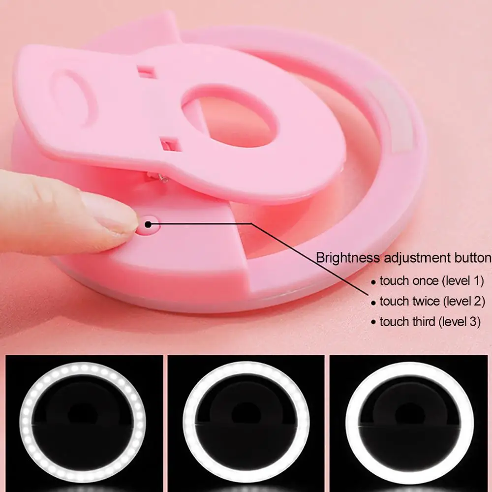 Светодиодный кольцевой светильник для селфи, Новый светильник для макияжа, светодиодная лампа для селфи, для мобильных телефонов, фото, Ночной светильник, светодиодная зеркальная неоновая вывеска, кольцо для селфи, Описание: 1. Продукт: три яркости Регулируемый Диммируемый кольцевой светильник 2. Режим питания: модель зарядки, оснащенная usb-кабелем для зарядки, без ограничения спецификации. Аккумулятор не нужен. 3. Преимущество: Легкий и компактный, портативный 4. Применимые электронные продукты: мобильные телефоны, компьютеры, планшеты Спецификация: 1. Цвет света: белый 2. Цветовая температура: 6000K 3. Мощность: 3 Вт 4. Материал: пластик 5. Цвет корпуса: белый/розовый/синий/черный 6. Напряжение: 5 В постоянного тока