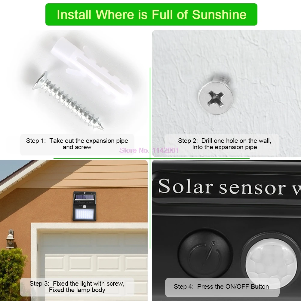 Пожалуйста, убедитесь, что солнечный светильник установлен в пределах 3 метров высоты и убедитесь, что солнечная панель может поглощать солнечный светильник.Перед использованием Включите переключатель.