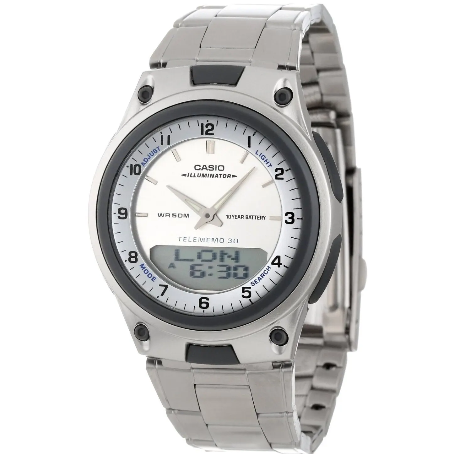 Мужские кварцевые наручные часы с телефонной книжкой, подсветкой и 10-летней батарейкой. Японская компания «Casio» известна созданием портативной электронной и вычислительной техники. В производстве часов «Casio» славится надежным качеством часовых механизмов, производимых, в основном, в Японии, разнообразием встроенных функций, а также широким ассортиментом с четко обозначенными модельными рядами, помогающими покупателю выбрать нужные часы. В ассортименте «Casio» представлены разные коллекции. Casio G-SHOCK известны как «неубиваемые» часы в крепком ударопрочном и водонепроницаемом корпусе с широким функционалом. Casio Baby-G – часы для детей (стрелочные и электронные, для мальчиков и девочек, часы в голубых, розовых и черных тонах). Casio Sheen Bluetooth – изысканные и стильные часы для женщин, сочетающие очаровательность и современные возможности, такие как синхронизация с телефоном по Bluetooth и автоматическая корректировка точного времени. Casio Pro Trek – высокофункциональные часы со специальными датчиками, такими как показатели компаса, барометра и термометра, питание от солнечной батарейки и др., что отлично подходит людям, ведущим активный образ жизни. Casio Outgear - бюджетный аналог ProTrek, туристические часы с высоким функционалом по демократичной цене. Casio Beside —мужские строгие стрелочные часы для ценителей минимализма и классики. Casio Edifice – часы-хронограф со сплит-функцией секундомера для любителей автомобильного спорта. Все эти модели объединяет высокая точность, бесперебойная работа механизма, широкий функционал, а также стильный и современный модный дизайн. Тип механизма: кварцевый. Тип батареи: от батарейки. Точность хода: +/-30 секунд в месяц. Способ отображения времени: электронный (цифры) и аналоговый (стрелки). Дисплей защищен пластиковым (акриловым, органическим) стеклом. Оргстекло обладает высокой ударопрочностью. Стекло имеет сферическую поверхность. Корпус из качественного пластика. Пластик имеет легкий вес, не боится влаги и обладает прочностью. Браслет из нержавеющей стали. Нержавеющая сталь – крепкий и долговечный материал, устойчивый к коррозии. Раскладывающаяся застежка с тройным сгибом, расстегиваемая одним касанием. Светодиодная подсветка циферблата. Для подсветки дисплея используется светодиод. Люминесцентная подсветка стрелок. Покрытие из необрита обеспечивает длительное освещение в темноте даже после кратковременного нахождения на свету. 12/24-х часовой формат времени. Телефонная книжка. Встроенное запоминающее устройство позволяет хранить фамилии и номера телефонов. Число соответствует максимальному количеству абонентов, на которое телефонная книжка рассчитана (30 номеров). Мировое время. Обеспечивает отображение текущего времени в некоторых основных городах и определенных регионах мира. 30 городов (29 часовых поясов), всемирное координированное время (UTC). Секундомер с точностью показаний 1/100 с и временем измерения 24 ч. 3 будильника, один с функцией (Snooze), ежечасный сигнал. Функция повтора сигнала будильника (Snooze). Функция повтора сигнала позволяет отложить время пробуждения. Функция ежечасного сигнала обеспечивает подачу часами звукового сигнала при наступлении каждого нового часа. Таймер обратного отсчета от 1 мин. до 24 мин. Автоматический календарь (число, день недели, месяц). Водонепроницаемость WR 50 (5 bar) - 5 АТМ. Водоз