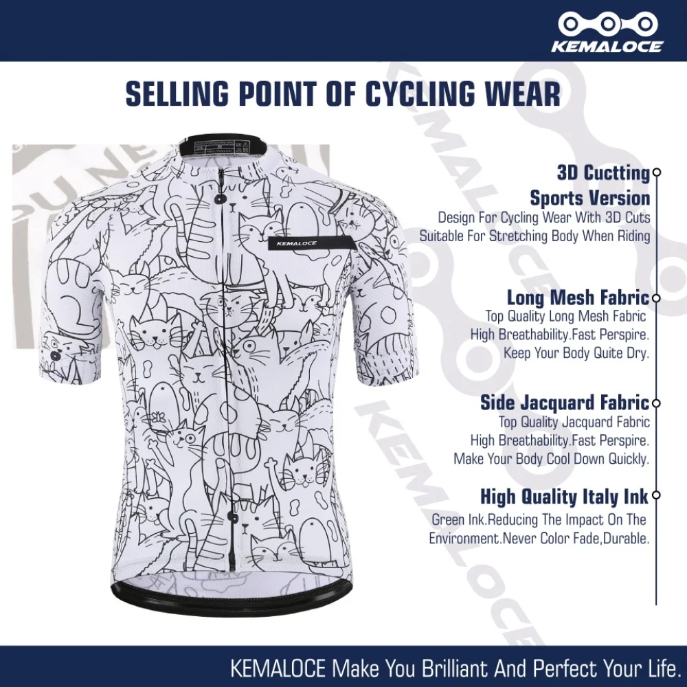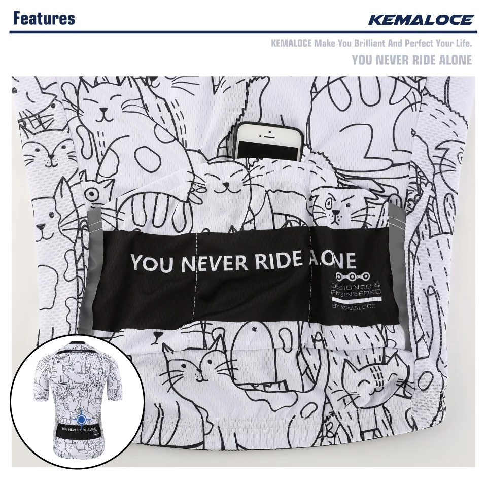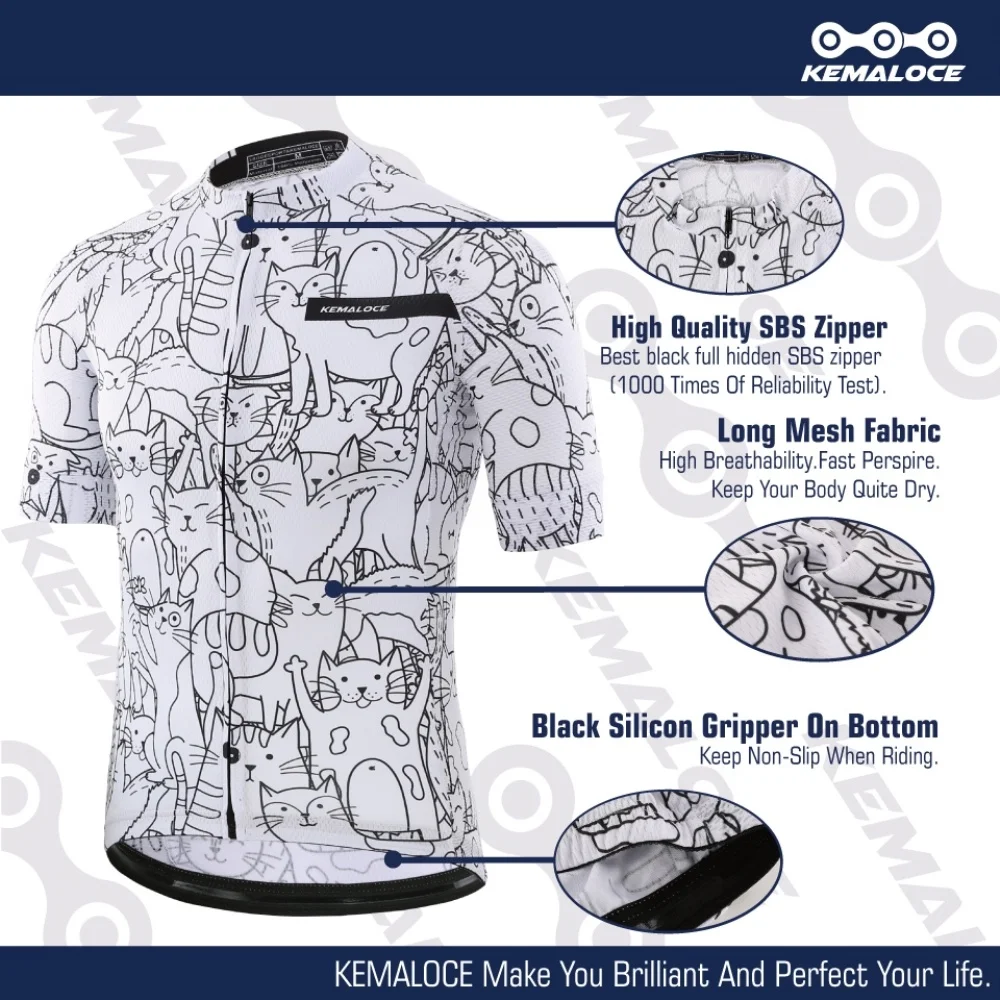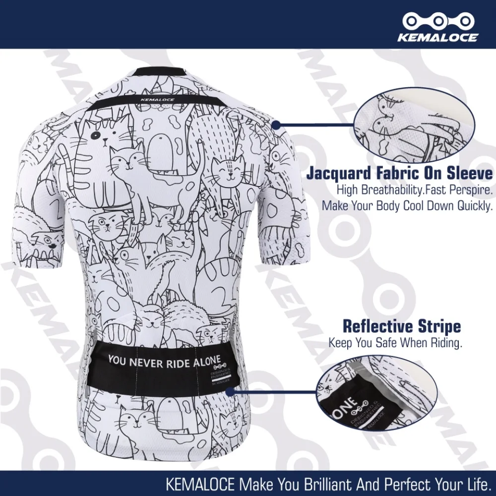 Дышащая белая велосипедная Джерси от Kemaloce в стиле унисекс с изображением мультяшного кота, Весенняя Экологически чистая велосипедная одежда с защитой от пиллинга, верхняя одежда для поездок на велосипеде