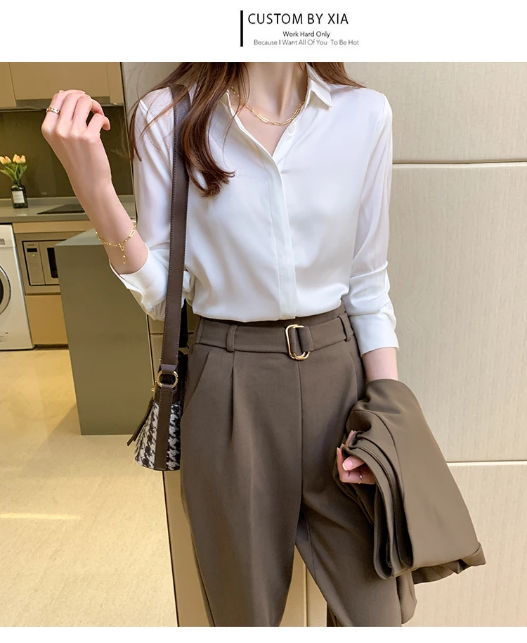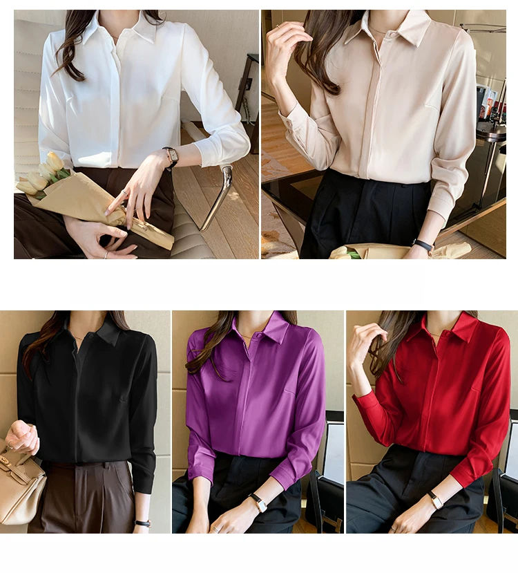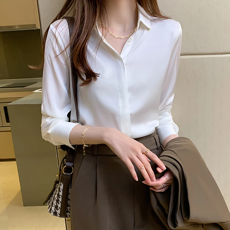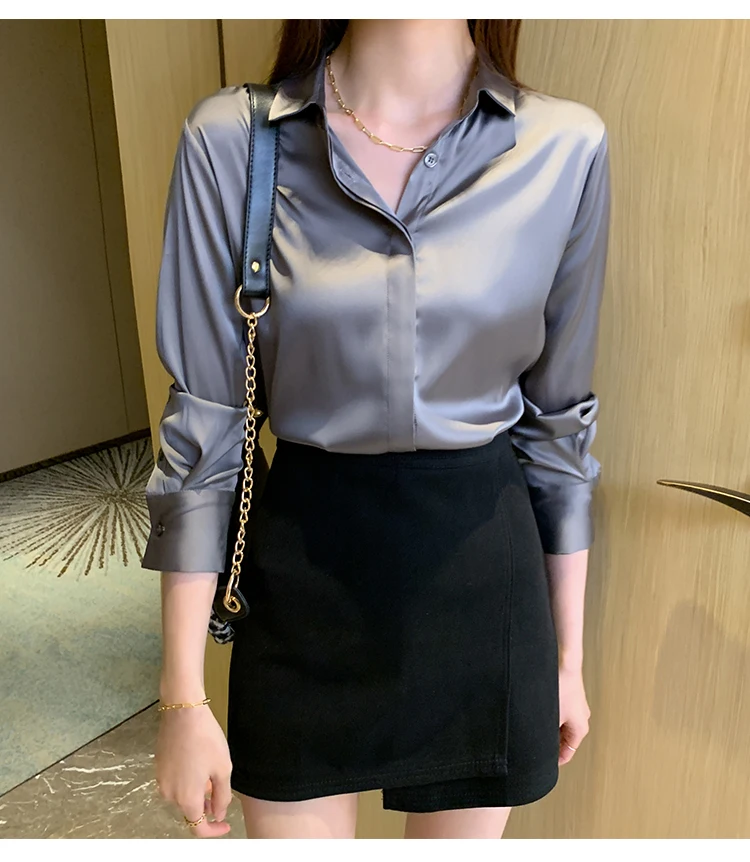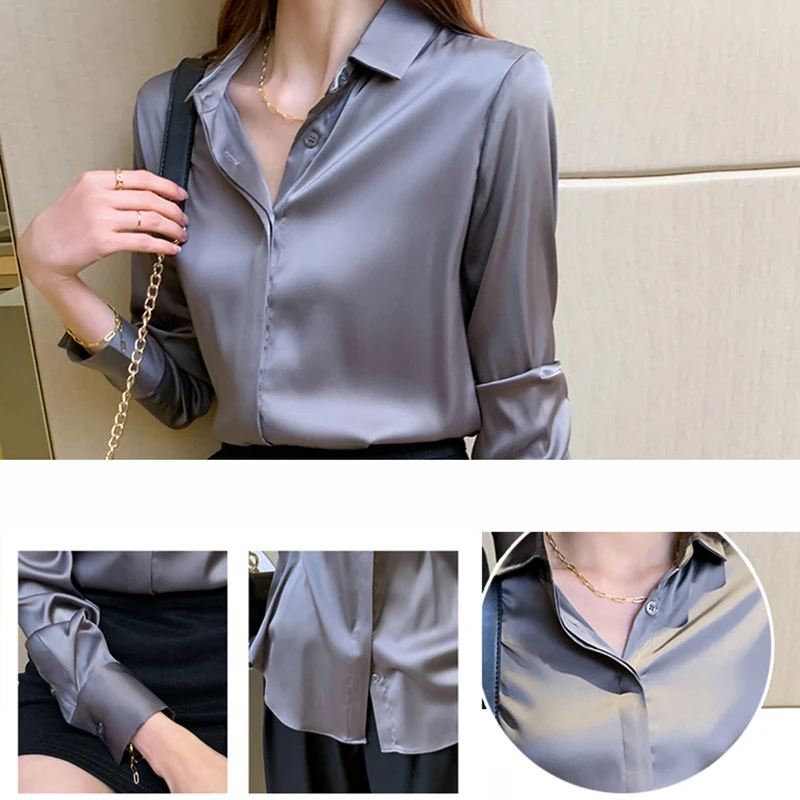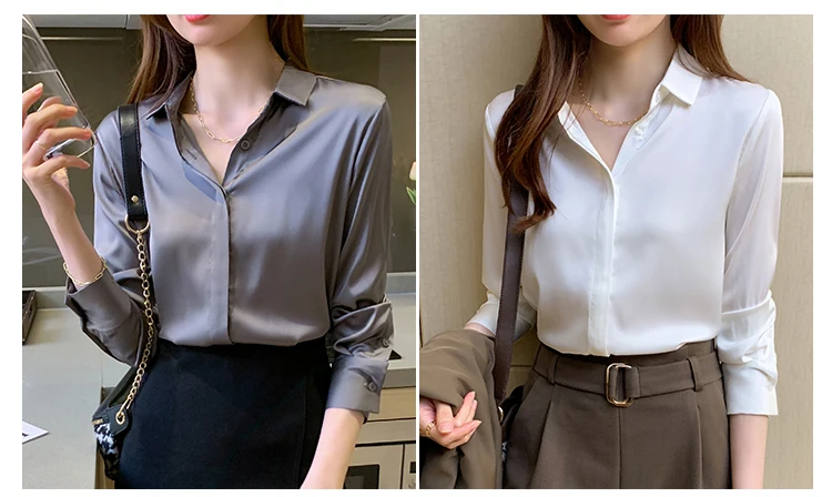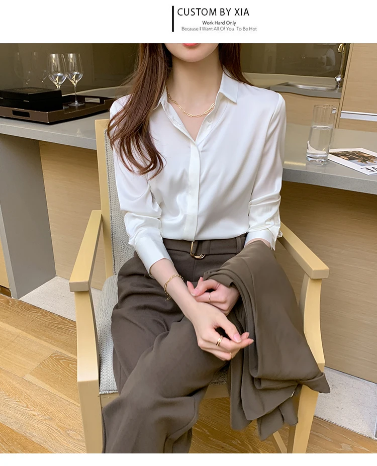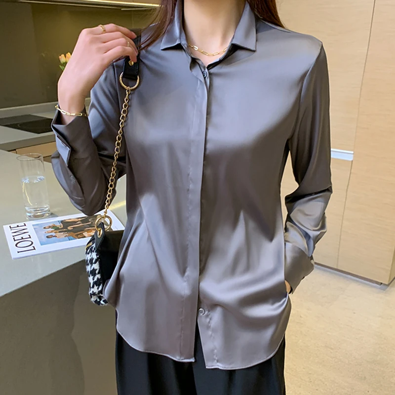 Шелковые рубашки, женские рубашки с длинным рукавом, блузки, Женская атласная одежда, рубашка, Офисная Женская демисезонная однотонная шелковая рубашка, блузка, топы