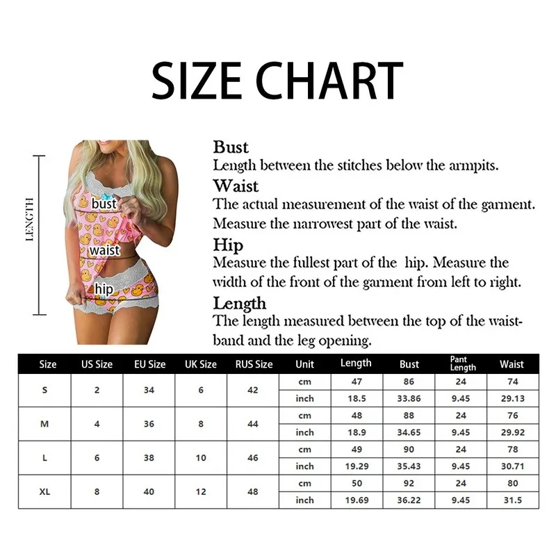 Особенности: женский сексуальный пижамный комплект; Модный кружевной комплект для сна с кружевной отделкой; Комплект одежды для сна с шортами с эластичной резинкой на талииПримечание: При ручном измерении допускается погрешность в 1-3 смРазмер: S-XLЦвет: Утенок, окрашивание Санта-Клауса, медведь, черный, розовыйМатериал: полиэстерПосылка включает в себя: пижамный комплектИнструкции по уходу: рекомендуется ручная стирка