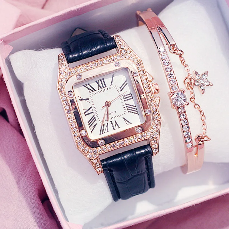 Женские модные ботинки, полусапожки, ботильоны с квадратным бриллиантовый браслет часы комплект Женская кожаная обувь кварцевые наручные часы женские часы Zegarek Damski