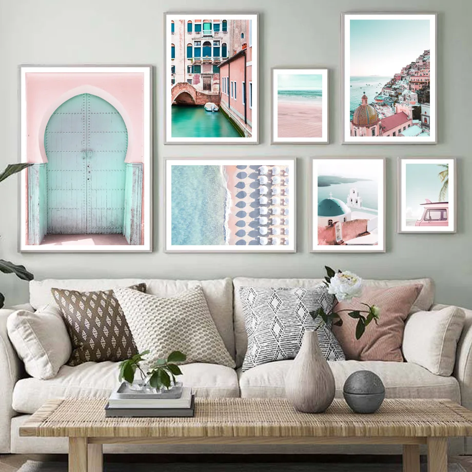 Настенные плакаты и картины с изображением розового города, трамвая...