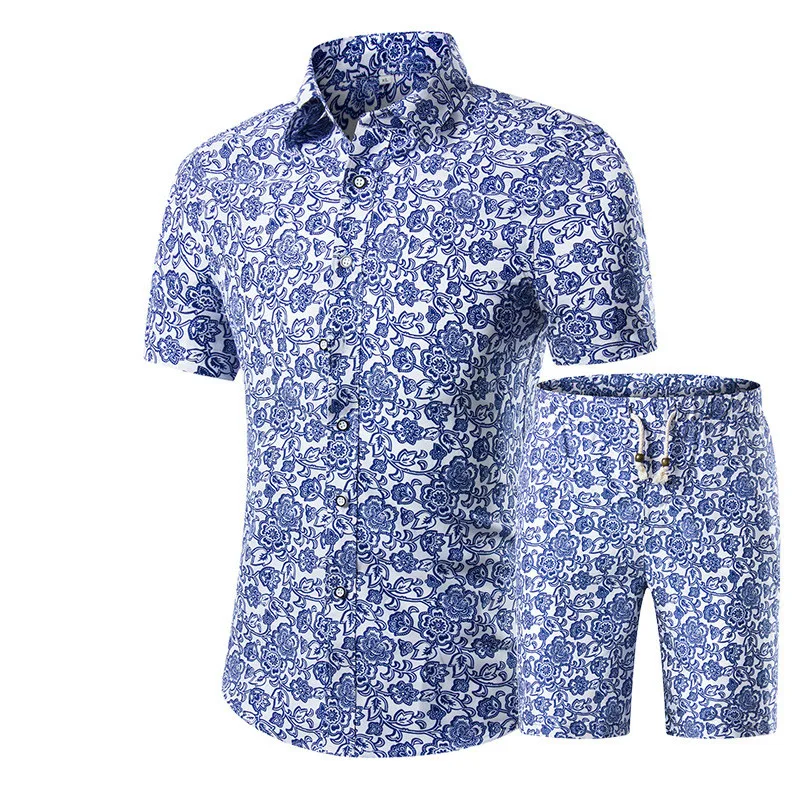 Floral Print Shirts Men+Shorts SetSummer Featured Printing Tracksuit