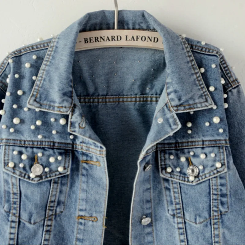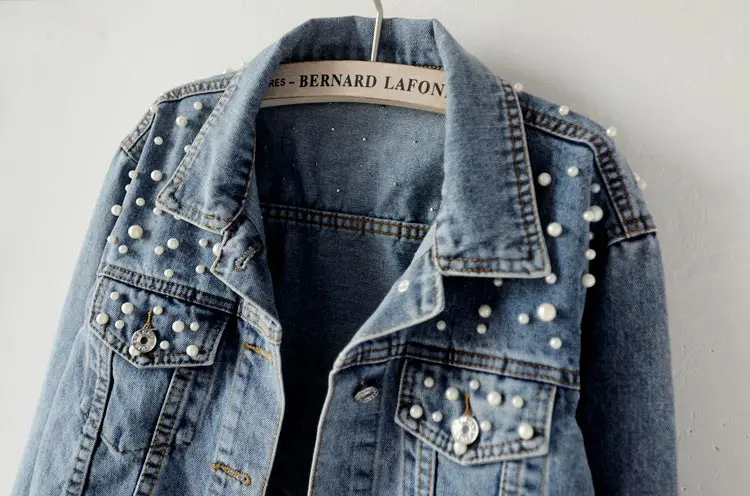 Женская джинсовая куртка-бомбер с длинным рукавом, с жемчугом
