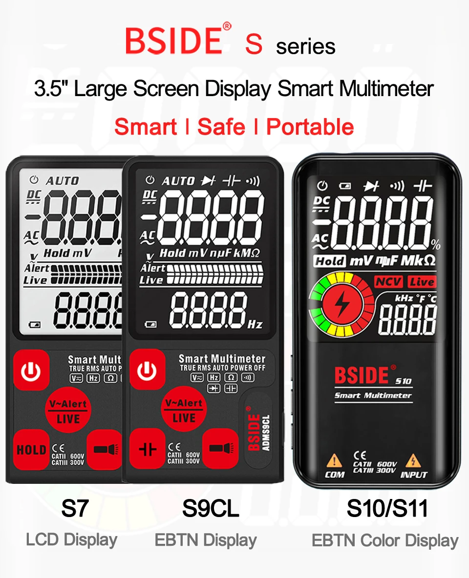Продукты серии BSIDE S относятся к последнему поколению BSIDE бренда smart мультиметр!3,5-дюймовый большой дисплей дизайн оставляет замечательный опыт пользователей для покупателей; Простой в использовании/костюм с одной пуговицей, чтобы переключить дизайн хорошо признано покупателями; ультратонкий корпус очень портативный.Предоставьте четыре товара на выбор (S7 / S9CL / S10 / S11). Изысканный внешний вид/надежная производительность/Полные функции, могут удовлетворить потребности различных групп людей и очень подходят в качестве подарка.